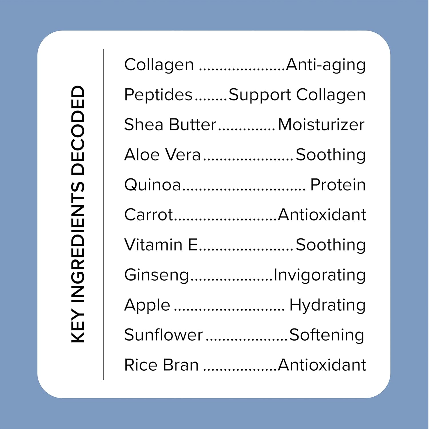 - NOURISHING + HYDRATING β With age our skin loses elasticity & moisture, our Clinically-Tested, Dermatologist-Tested, & Allergy-Tested hydrating Collagen + Peptides formula visibly smooths the look of skin's rough texture, plumps overall skin tone, & replenishes essential moisture to visibly restore volume to areas prone to sagging, dark spots, & wrinkles. Nourish, hydrate, & plump your skin for a healthier, fuller, & younger appearance while also improving your skins elasticity all at once.
