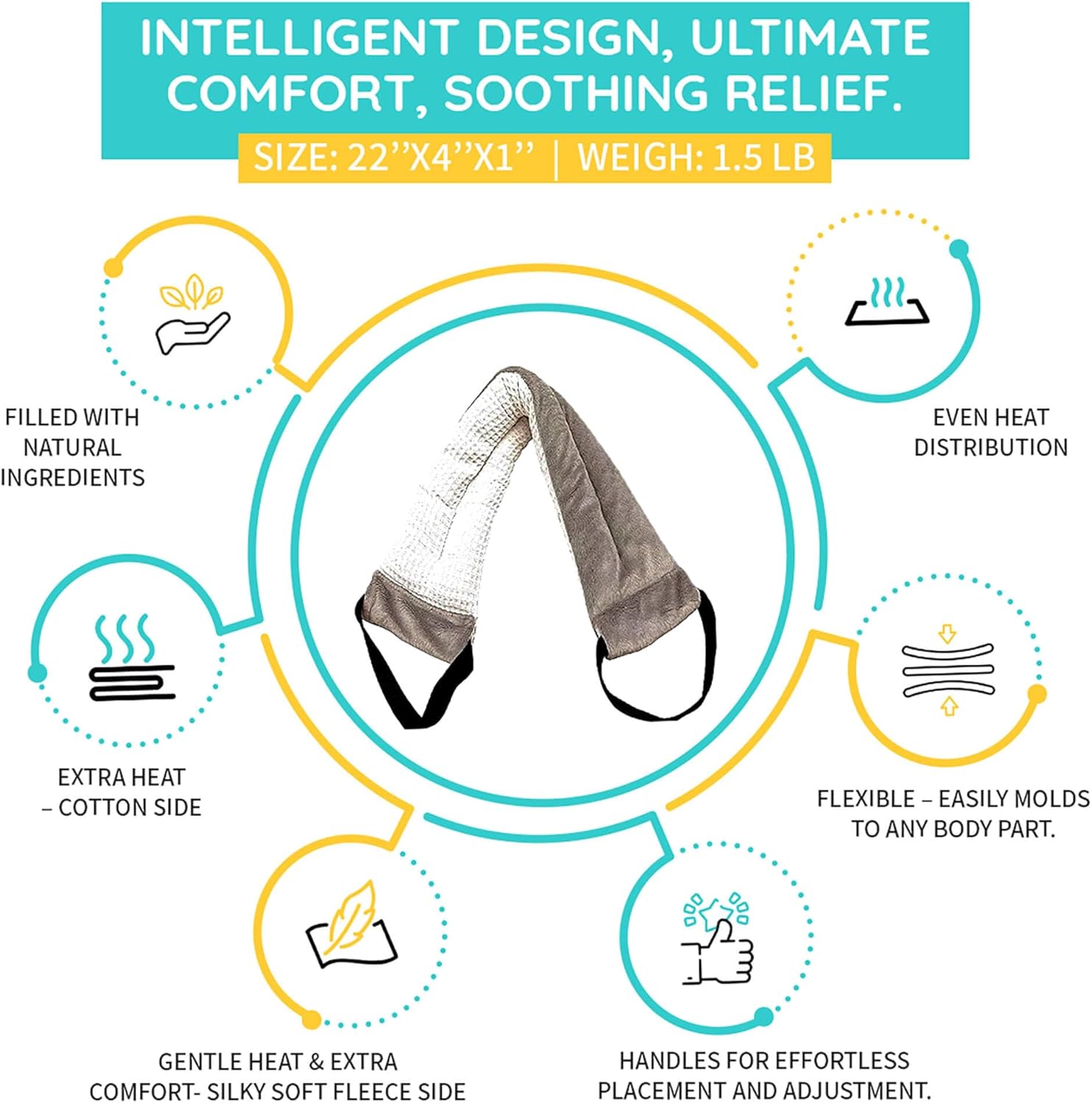 - FLEXIBLE & VERSATILE: Our heating pads heat up quickly and can easily be applied to any part of your body. It can be used as a neck heating pad, shoulder heating pad, or wrap heating pad for your back. Get relief on any part of your body that needs soothing. Our microwave heat pad uses its ideal weight to hold it in place and gently deliver heat therapy pressure.
