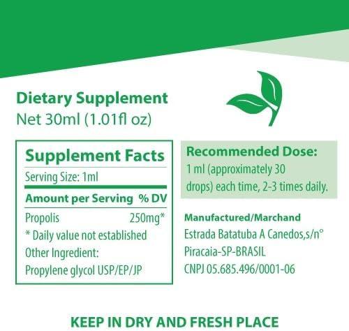 - Ingredients: 1) top quality Brazilian Green Propolis and 2) the only necessary solvant of Propylene Glycol USP/EP/JP to ensure the United States Pharmacoeia, Europe Pharmacopeia, and Japanese Pharmacopeia level of quality standard. Contains no honey, no sugar, no wax, no alcohol(Ethanol), no gluten, no dairy, no soy, no egg, no corn, no wheat, no flavor, no impurity, no residue