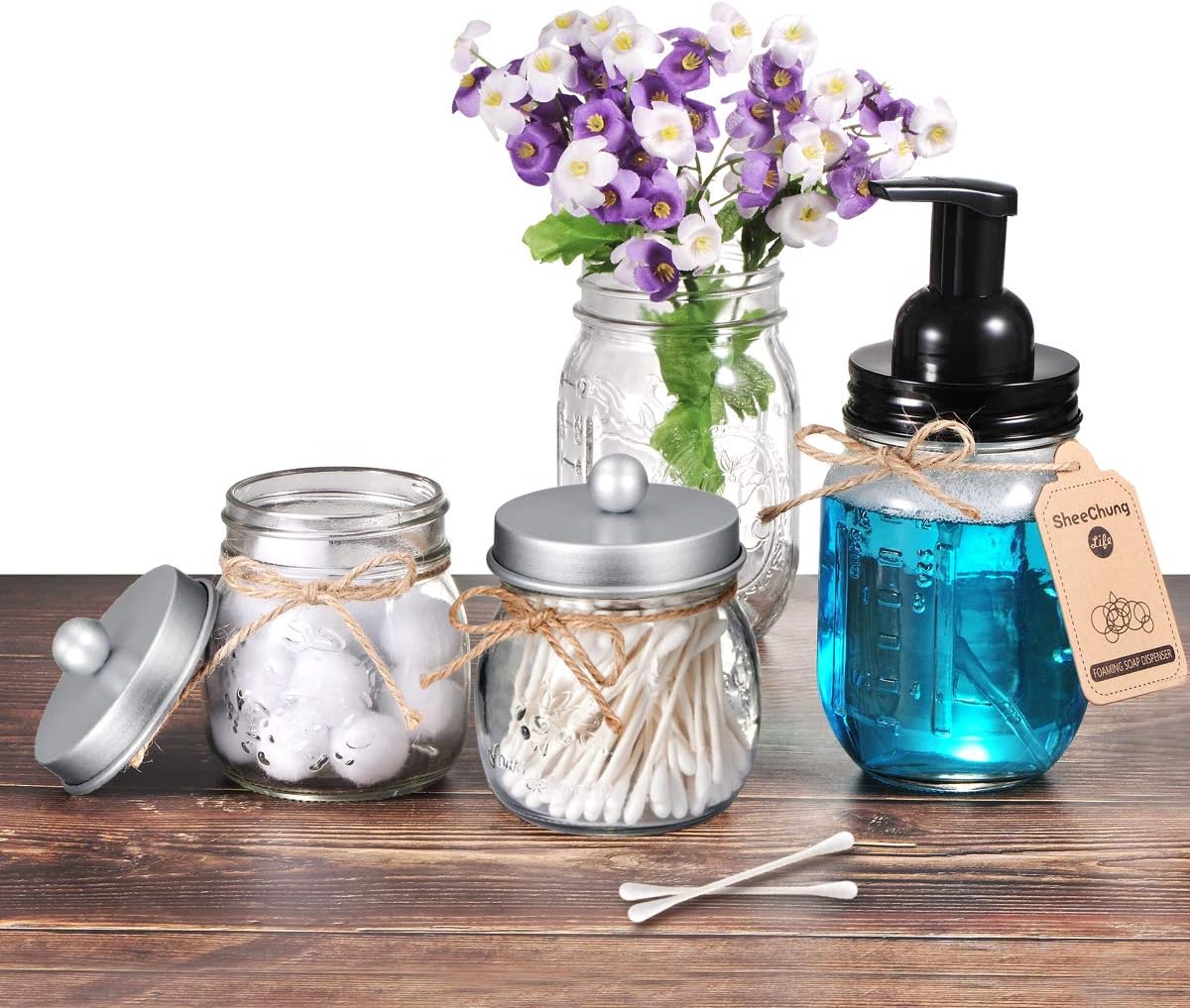 - 💐Elegant and Cute Bathroom Decor: Add charm to your bathroom with this glass bathroom mason jars set! Perfect accent to bathroom shelving, bathroom countertop, makeup vanity, carft room, black and white accented bathroom, and guest bathroom. Ideal for home decor, this collection embodies a variety of styles including rustic, western, farmhouse, and contemporary designs. It is particularly well-suited for bathroom decor and offers a versatile aesthetic that complements both traditional and modern interiors.