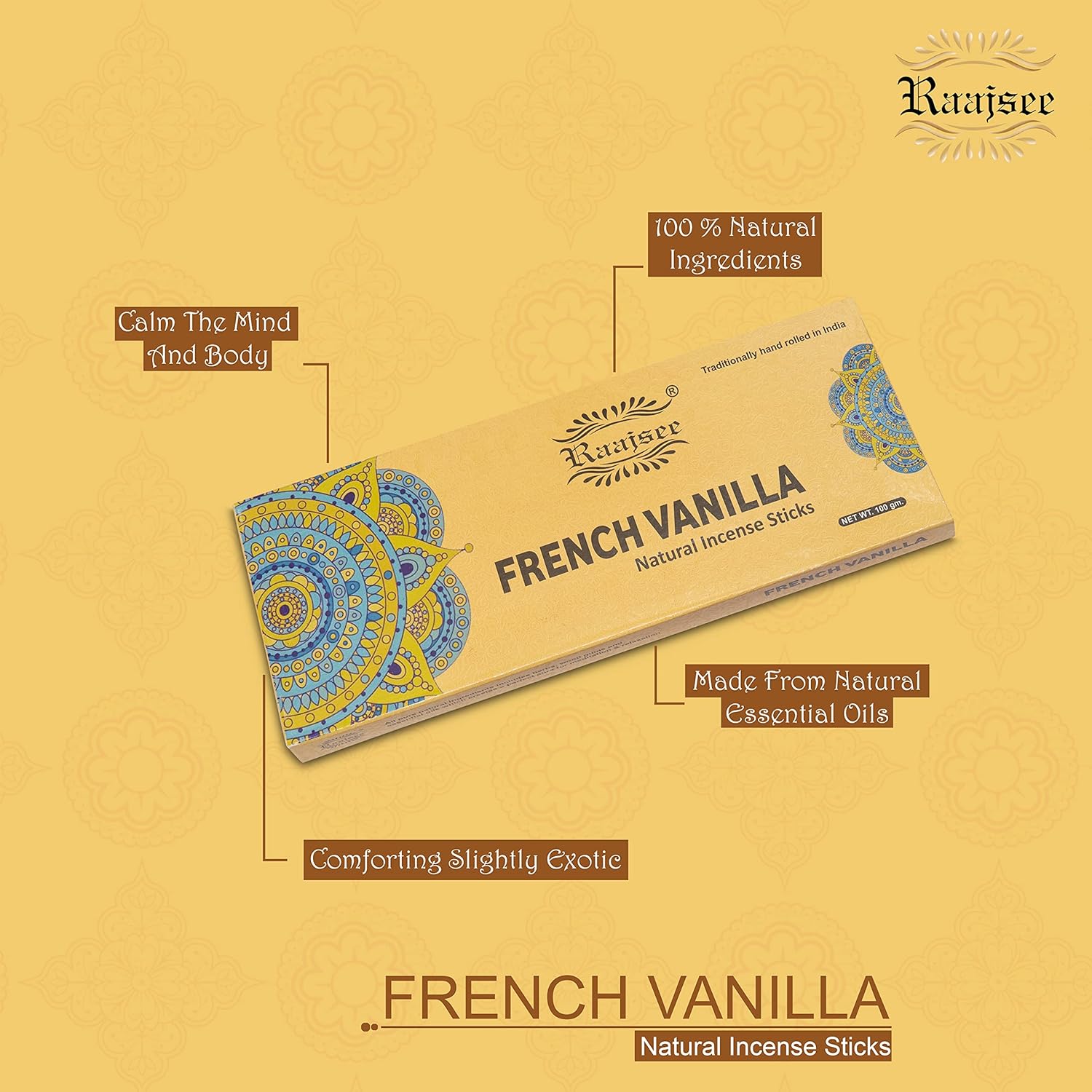 Raajsee Vnilla Incense Sticks 100 Gm Pack-100% Natural Insence Sticks -Organic Non Toxic - Charcoal Free - for Church,Aroma Therapy,Relaxation,Meditation