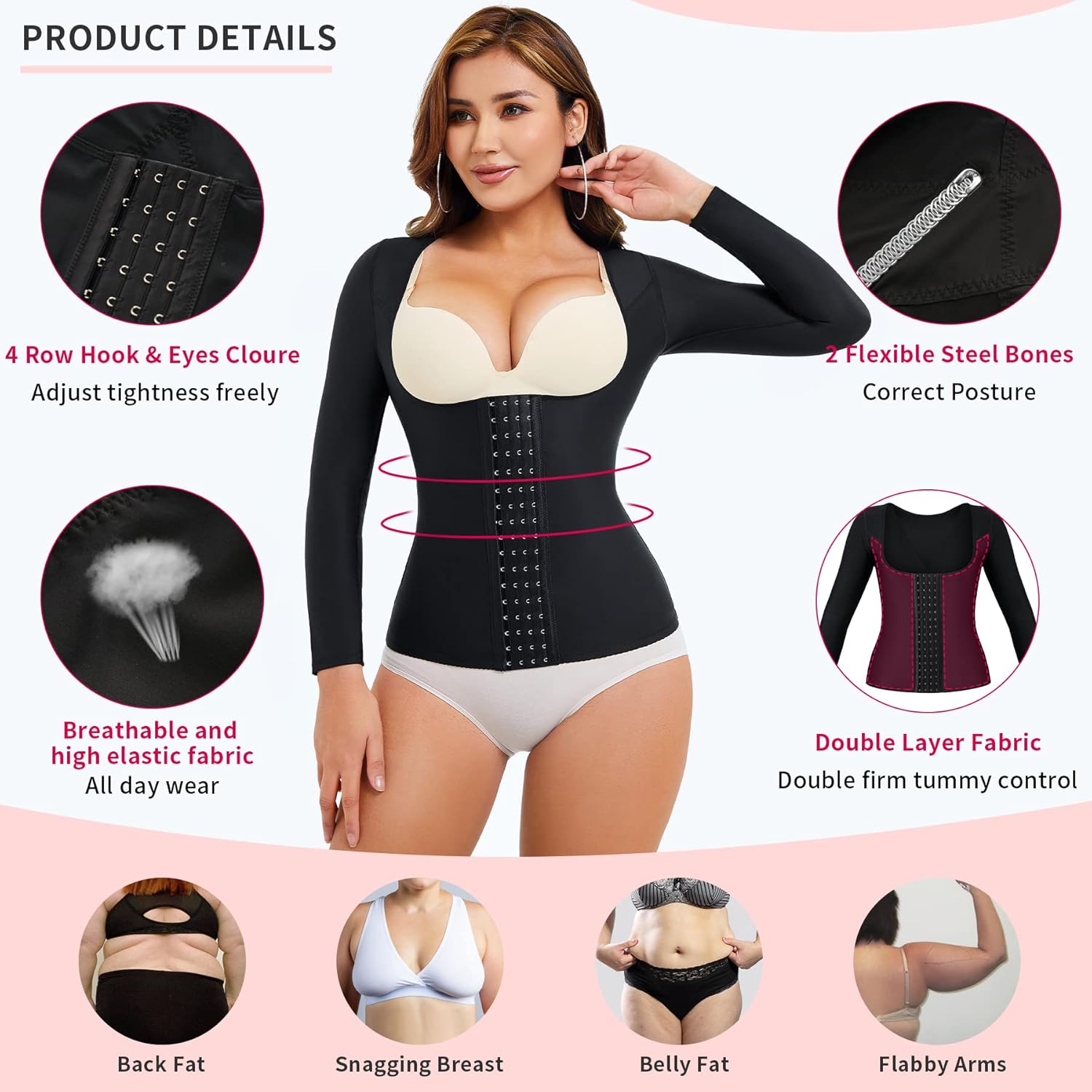 • UPPER ARM SHAPER COMPRESSION : Our waist training corset design with high stretchable long sleeve, best for arm liposuction recovery to tighten loose skin, smooths and tights bumps and bulges, reduce arm and back flab, hide your back rolls, give your a slimmer figure. If you no need too tight,we suggest you to have the bigger size.