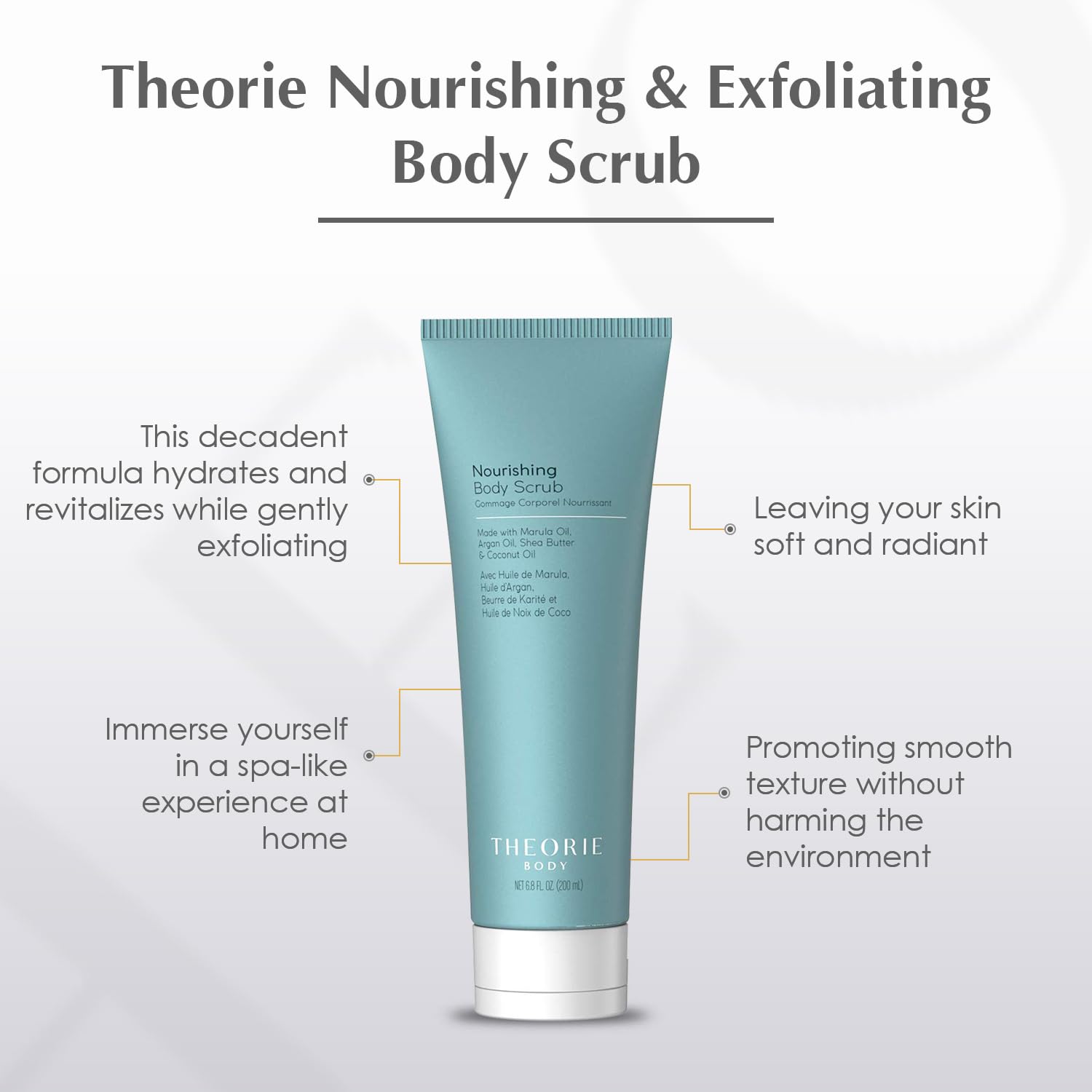 Theorie Nourishing and Exfoliating Body Scrub - Made with Marula, Argan, Coconut Oil, Shea Butter & Vitamin E, Amber Rose Fragrance. Eco-Friendly Pumice, Vegan, Gluten Free, Cruelty Free 200mL Tube