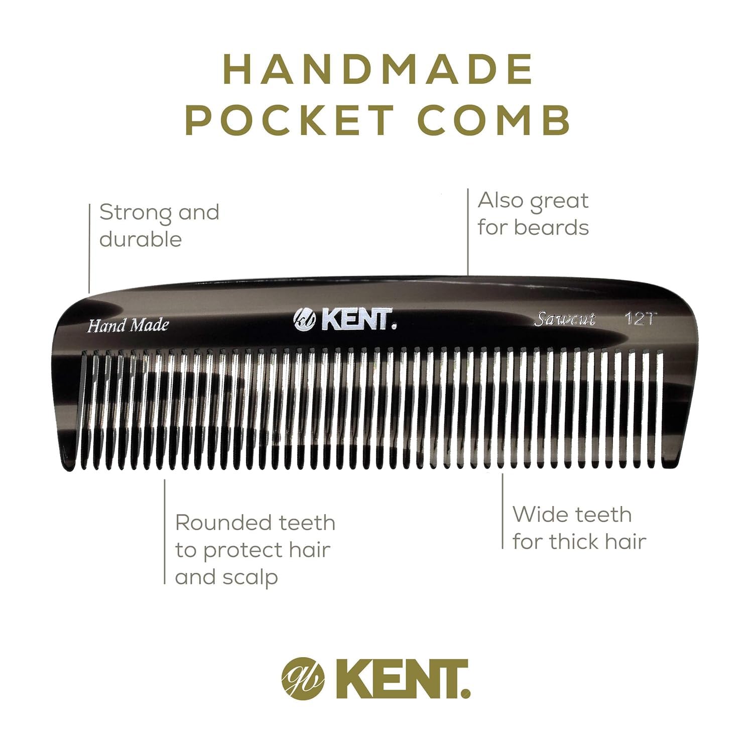 Kent 12T G Wide Tooth Detangling Comb - Handmade Pocket Comb for Thick, Curly, Wavy Hair - Large Tooth Hair and Beard Grooming Comb - Saw-Cut and Hand Polished