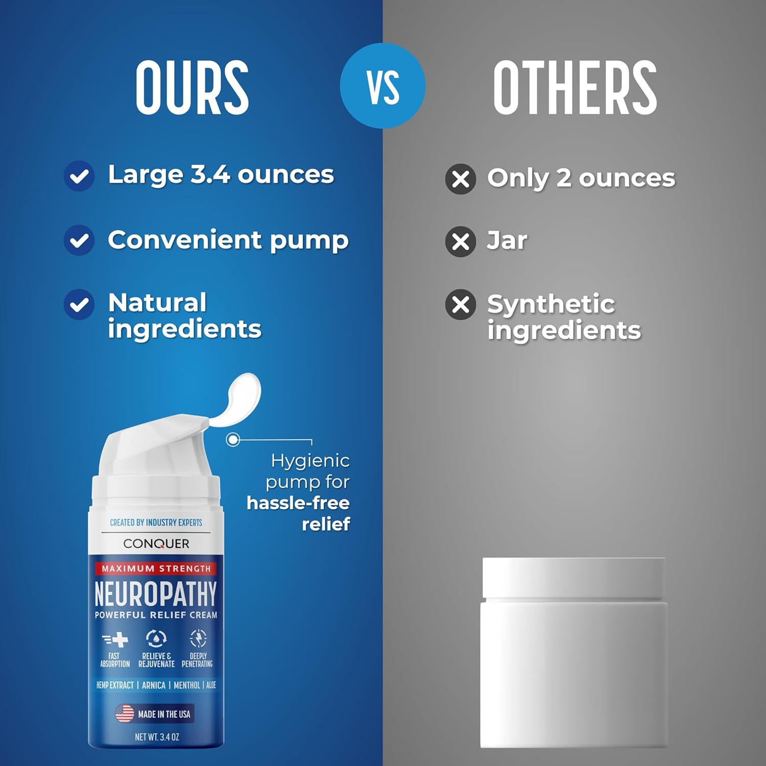 - [TRUST EXPERTISE FOR BETTER RELIEF]: Developed with over 10 years of pain relief expertise, Conquer Neuropathy Relief Cream provides a maximum-strength solution. Our formula is designed to help neuropathy sufferers reclaim their comfort and daily activities.