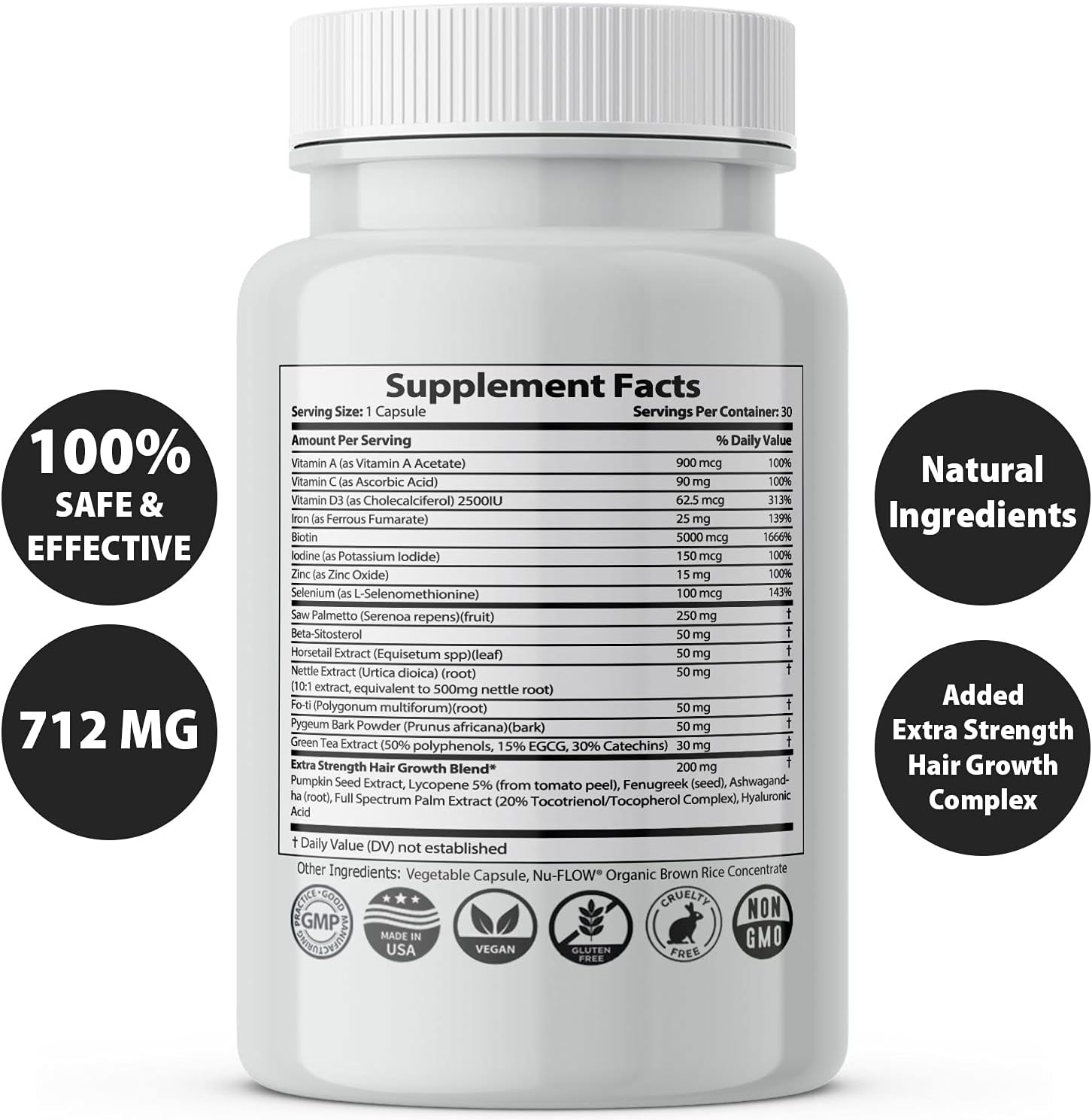 - Highly effective combination of other clinically proven extra strength ingredients such as Horsetail, Nettle Extract, Fo-TI, Pygeum Bark Powder and Green Tea Extract, Pumpkin Seed Extract, Lycopene, Fenugreek, Ashwagandha, Full Spectrum Palm Extract, & Hyaluronic Acid to help regenerate failing hair follicles, regain your hair, fight hairloss thinning, & boost your nutrition & health care. 1 month supply per bottle, stimulator & thickener.