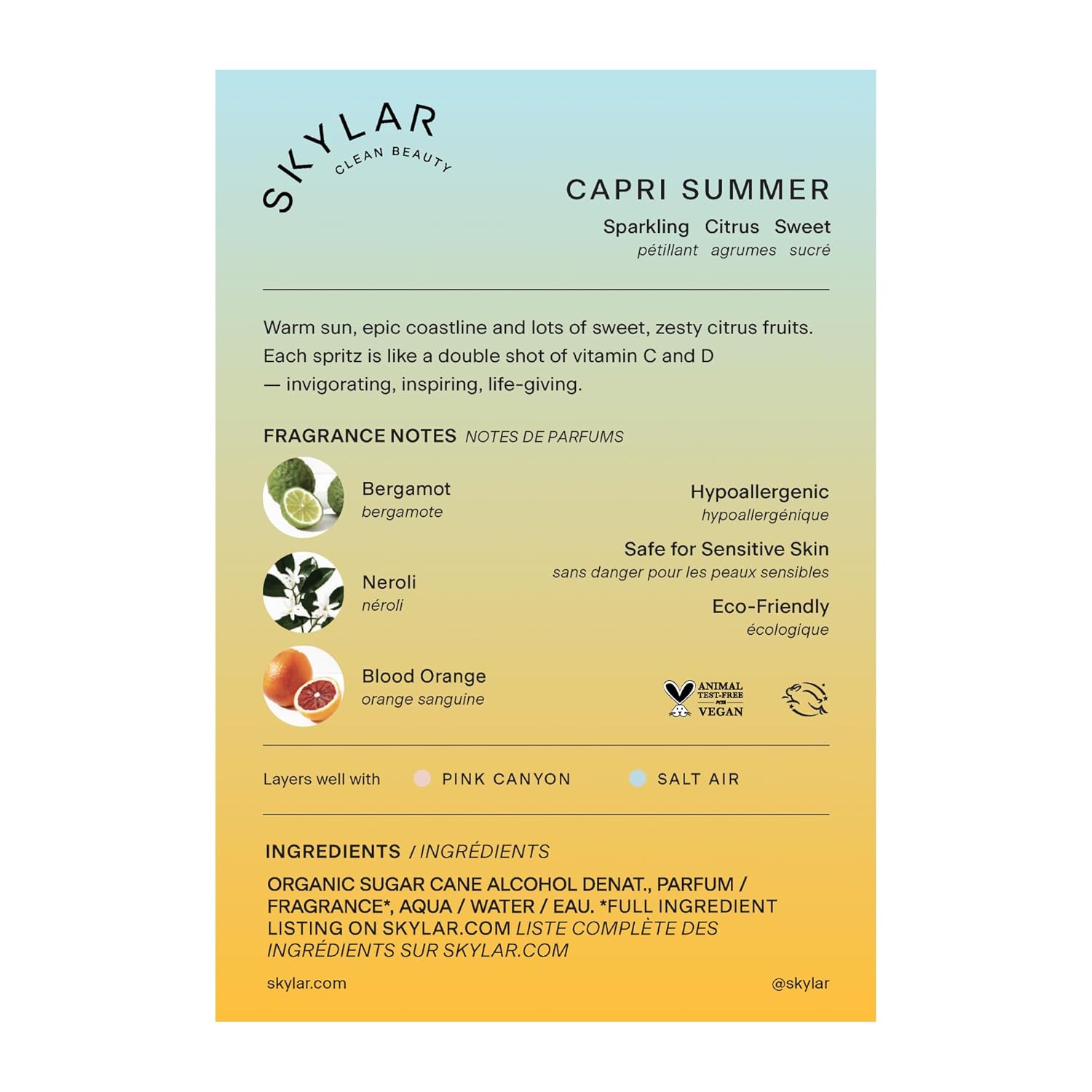 Skylar Capri Summer Eau de Parfum - Hypoallergenic & Clean Perfume for Women & Men, Vegan & Safe for Sensitive Skin - Fruity Citrus Perfume, Bergamot, Neroli & Blood Orange - 50mL /1.7 Fl oz