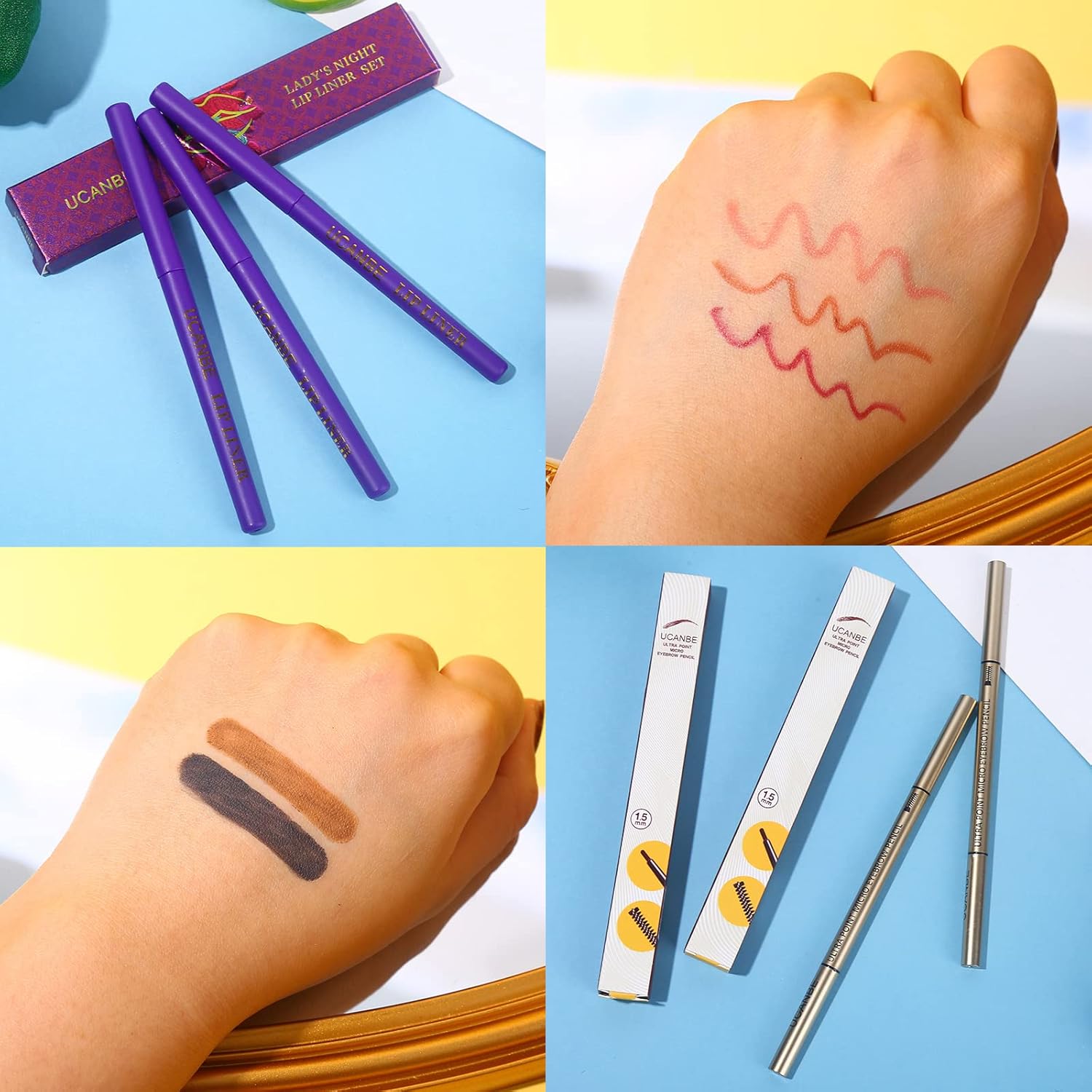 - This makeup bundle contains black & brown eyebrow pencil, 3* matte liquid lipstick, 3* lip liner, 1* eye liner pen, 1* eye primer and 15* pink cosmetic brushes. Also come with 1* 86 colorful big pallet, which has 80 colors eye shadow from soft earth tone down to vibrant tone that has matte shimmer and glitter finish. This rainbow plattet also got 2* highlighters, 2* contours, 2* blushers.