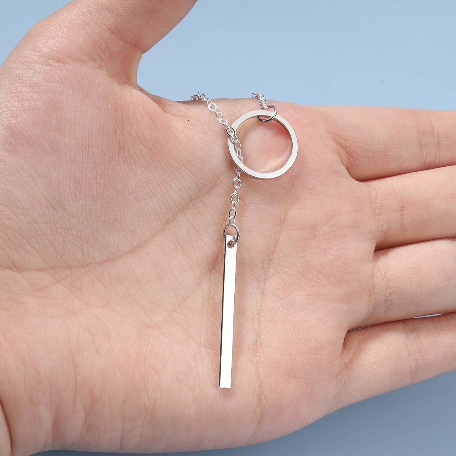 Boho Circle Bar Lariat Necklace Silver Drop Bar Y Necklace Open Circle Necklace Long Vertical Bar Necklace Chain Jewelry for Women and Girls Gifts
