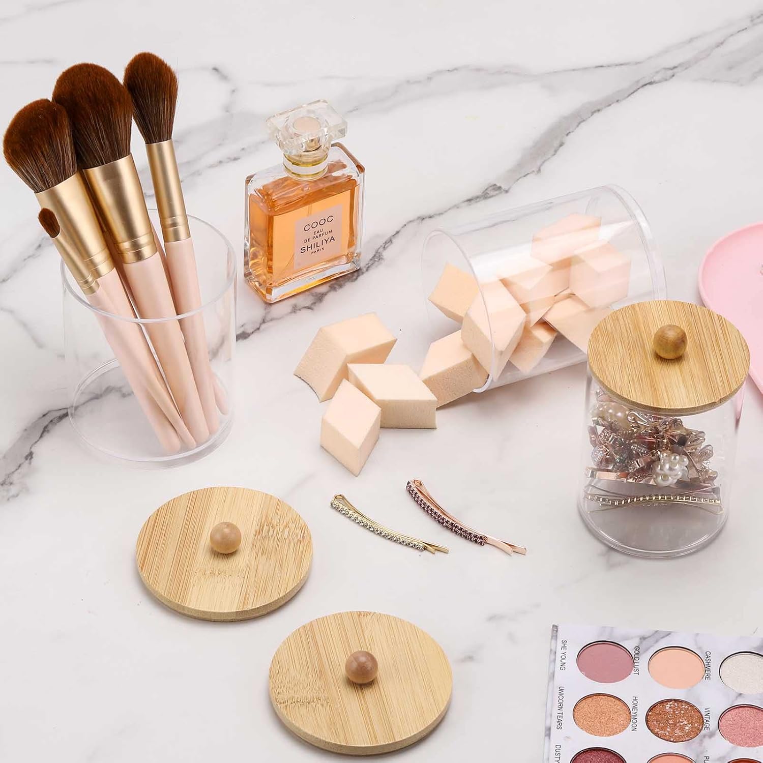 - Q tip Storage Organizer - Look like glass but are a really sturdy plastic and will not shatter, safe for kids