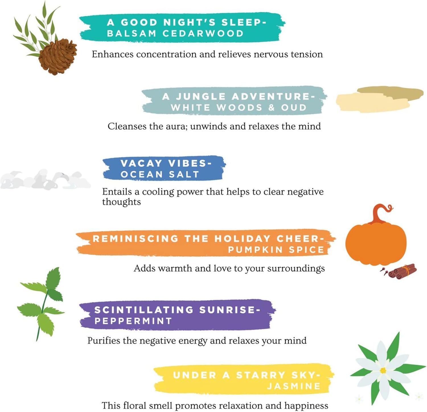 - Fragrance Notes β This incense pack combines uplifting woody notes with rustic undertones with fragrances like Balsam Cedarwood inscents, Jasmine incense, White Woods & Oud insenses, Ocean Salt, Pumpkin Spice Incense. Suitable for meditation rooms, bedrooms, living areas, and even office spaces.