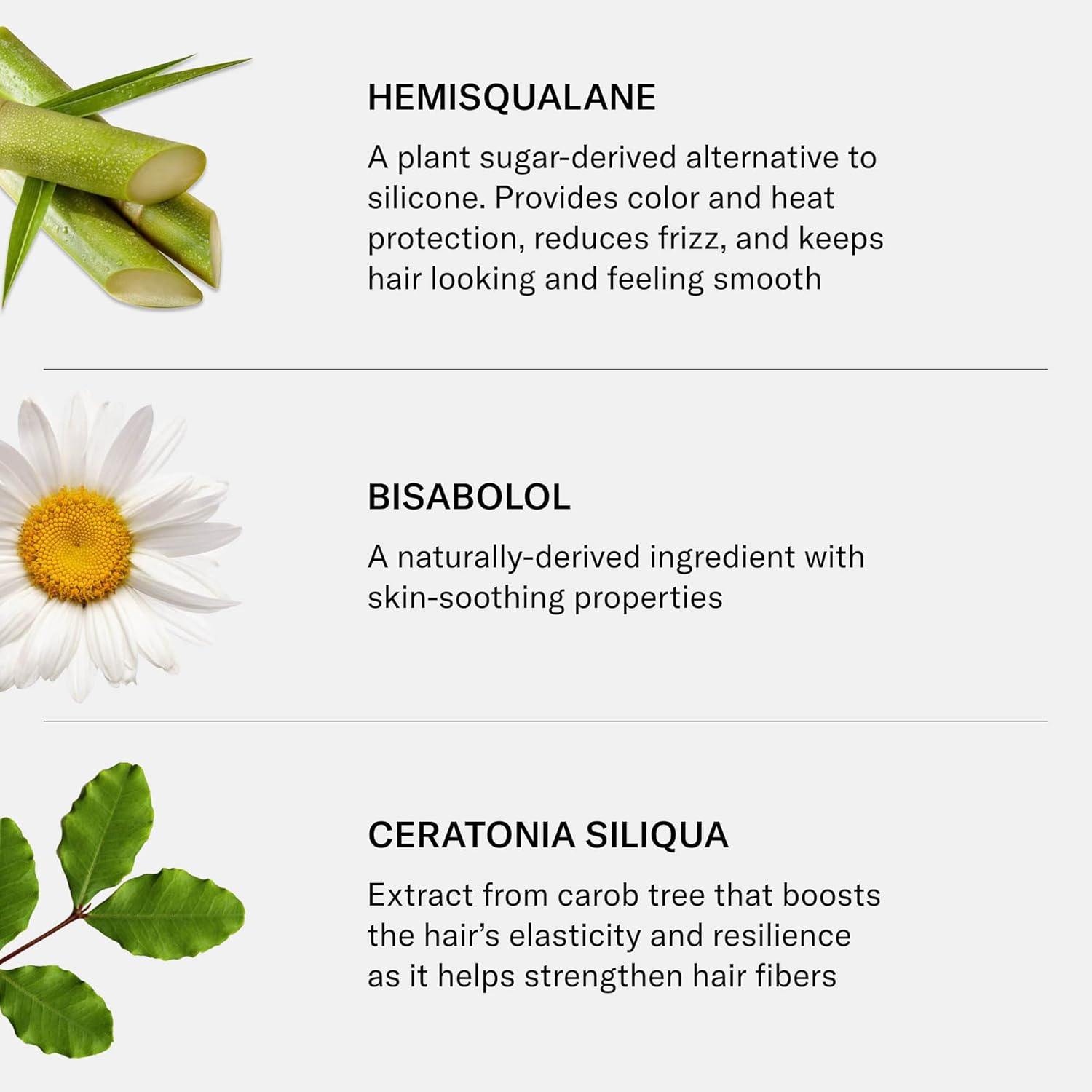 - Hero Ingredients: Hemisqualane โ a plant sugar-derived alternative to silicone that provides color and heat protection, reduces frizz, and leaves hair smooth. Bisabolol โ a naturally derived ingredient with skin-soothing benefits. Ceratonia Siliqua โ carob tree extract that boosts elasticity and strengthens hair fibers. Moringa Oleifera โ horseradish tree extract that shields hair from pollution and UV rays. Squalane โ a plant-derived moisturizer that nourishes, restores luster, and adds shine.