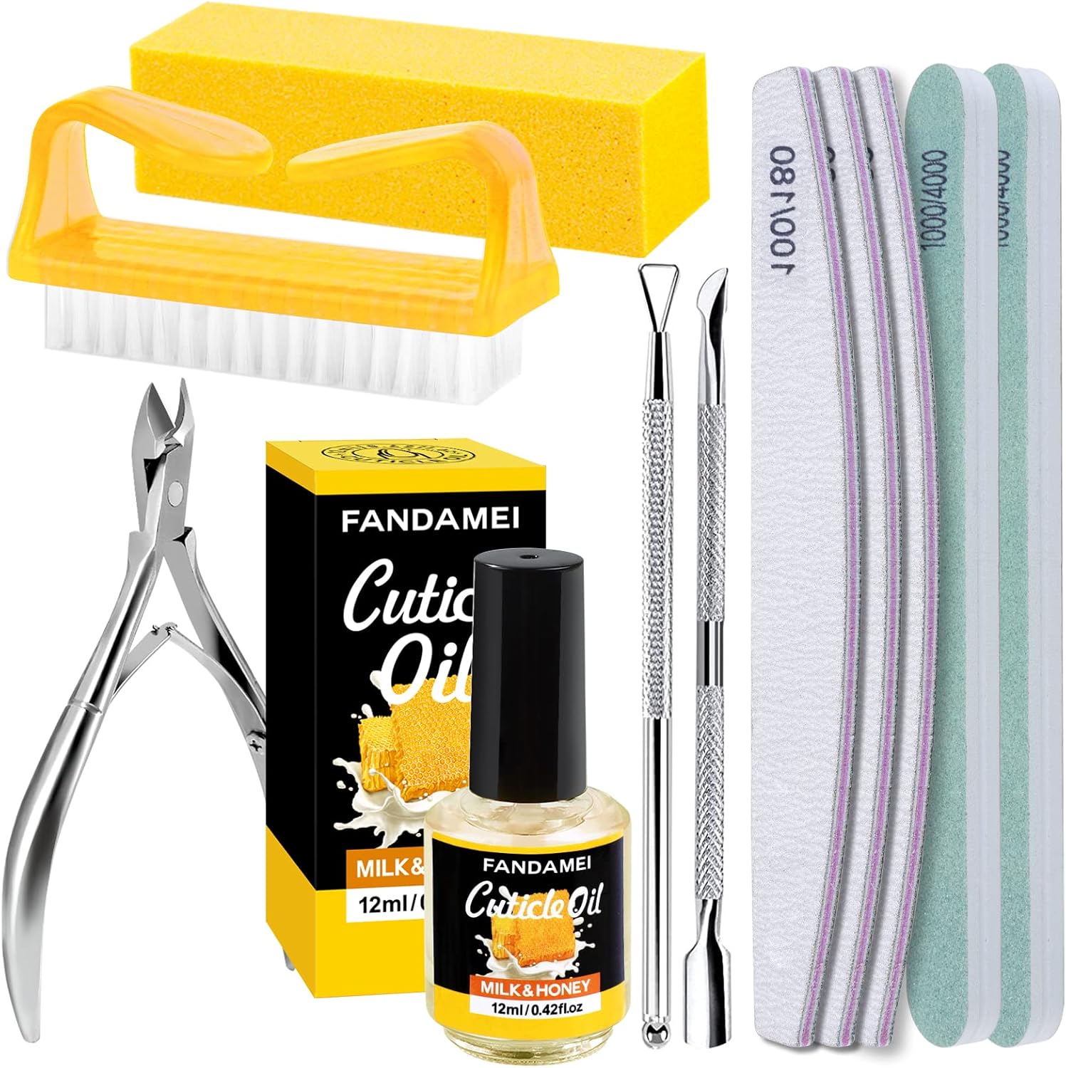 - Package Included: 3PCS 100/180 grit double sided nail files, 2PCS white and green nail polishing buffer, 1PCS yellow rectangular nail buffer block, 1PCS cuticle nipper, 1PCS cuticle pusher, 1PCS cuticle peeler scraper, 1PCS 12ml/0.42oz milk and honey nail cuticle oil and 1PCS nail dust brush. Professional manicure tools kit for daily nail care use and salon.