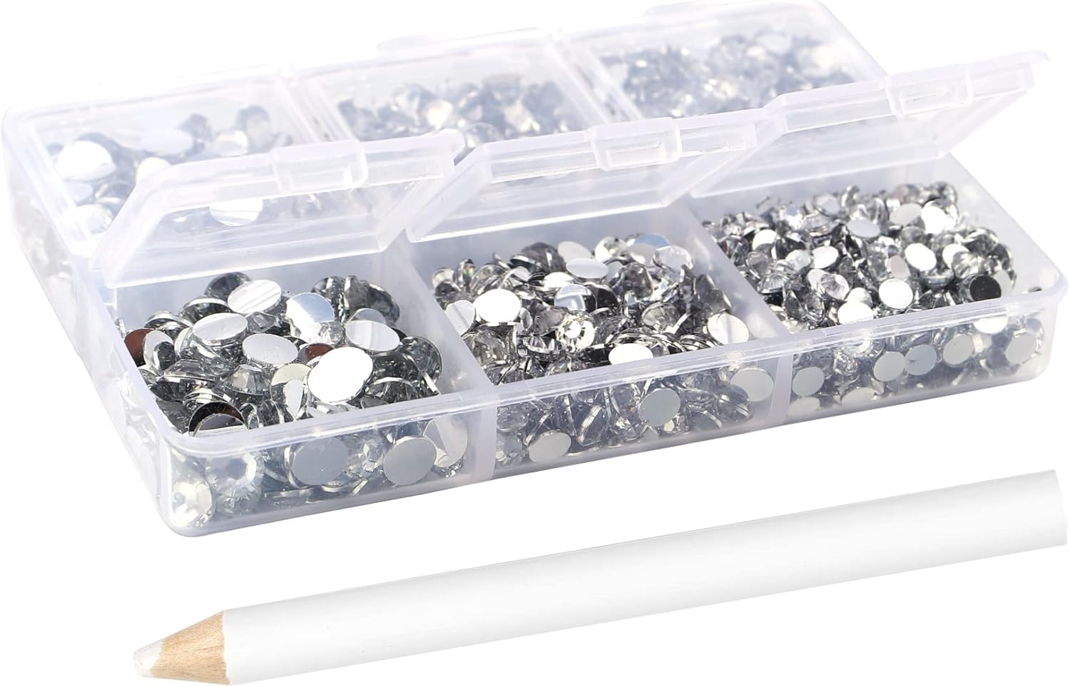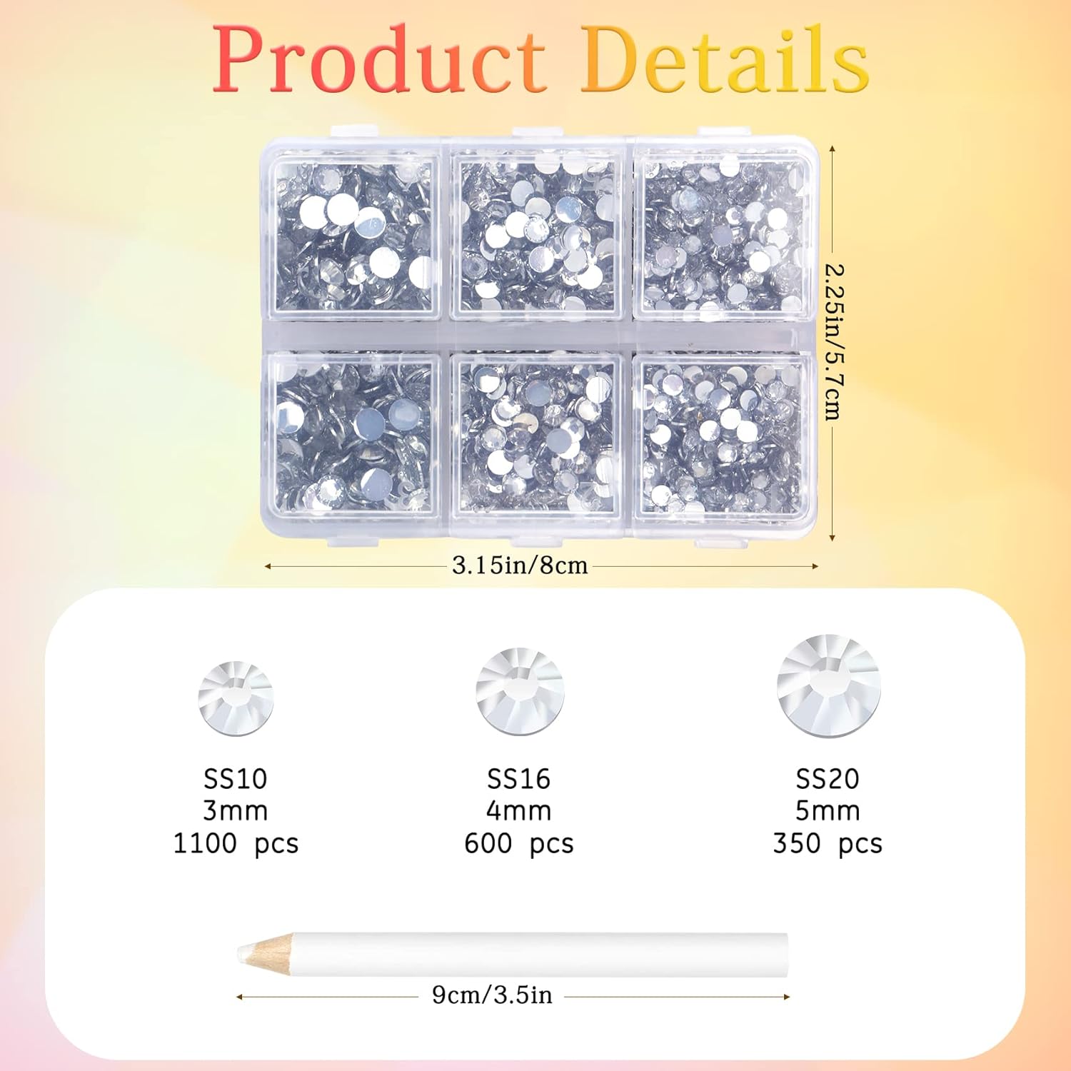 - 3 Sizes Rhinestones Set with Pick Up Pen: 2050 pcs per box. Round flat backs &Non Hotfix, SS10 (3mm) 1100PCS, SS16 (4mm) 600PCS / SS20(5mm) 350PCS.
