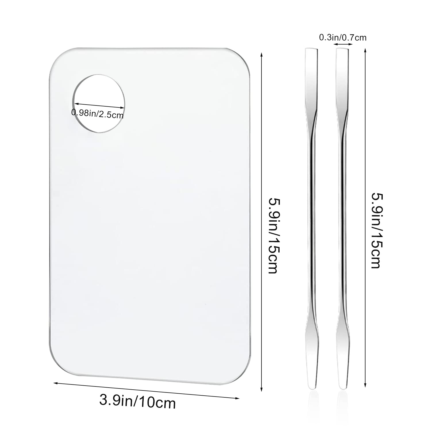 - 【Perfect Size】Foundation palette:15×10cm/5.9x3.9inch,makeup spatula:15cm/5.9inch, it can fit your hands and let you have a gorgeous makeup, the exquisite package contains 2pcs acrylic makeup palettes and 2pcs stainless spatula, easy to fits your makeup bag, perfect size for traveling and taking along.