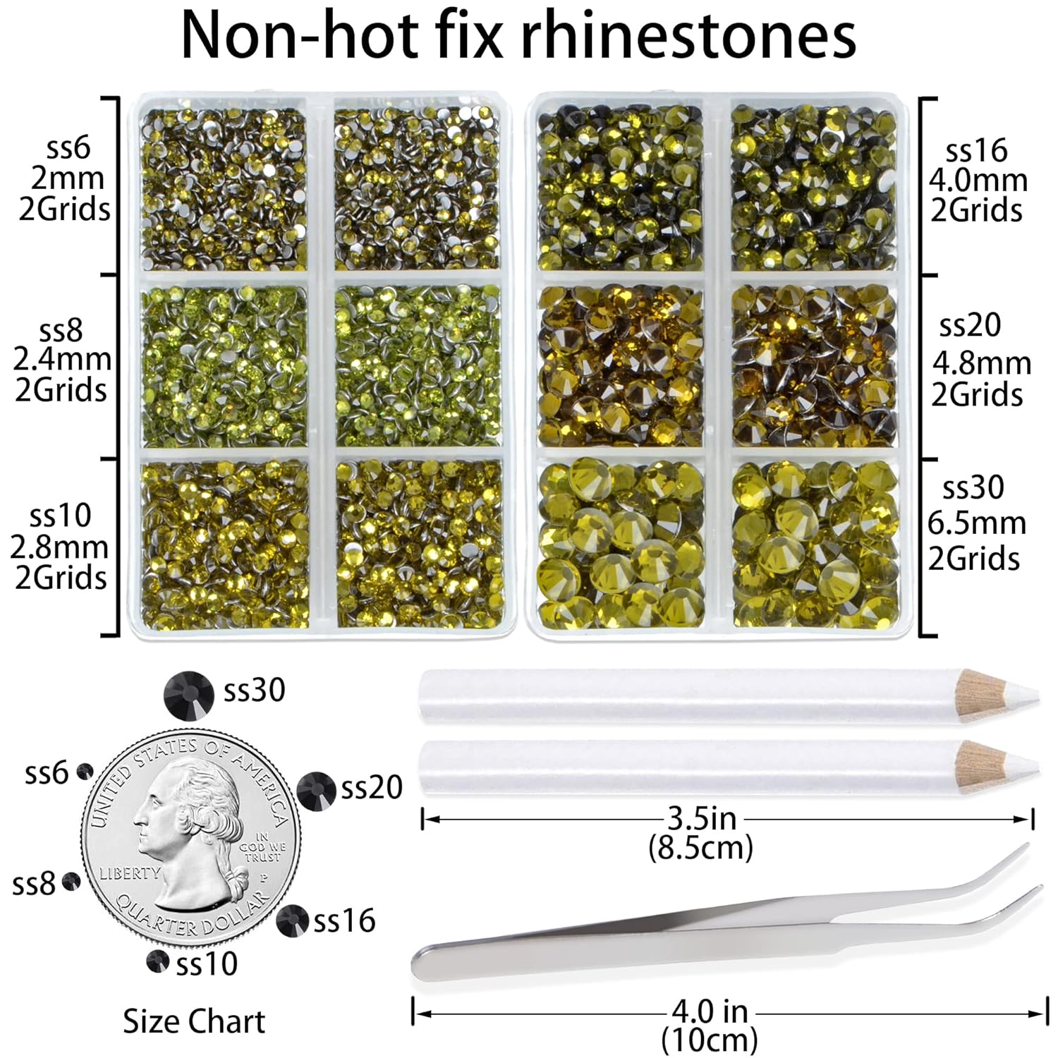 - Approx 6000 pcs of good quality sparkly flatback glass rhinestones with tweezers and 2 picker wax pencils help you easily pick up and set rhinestones in all your jewelry.