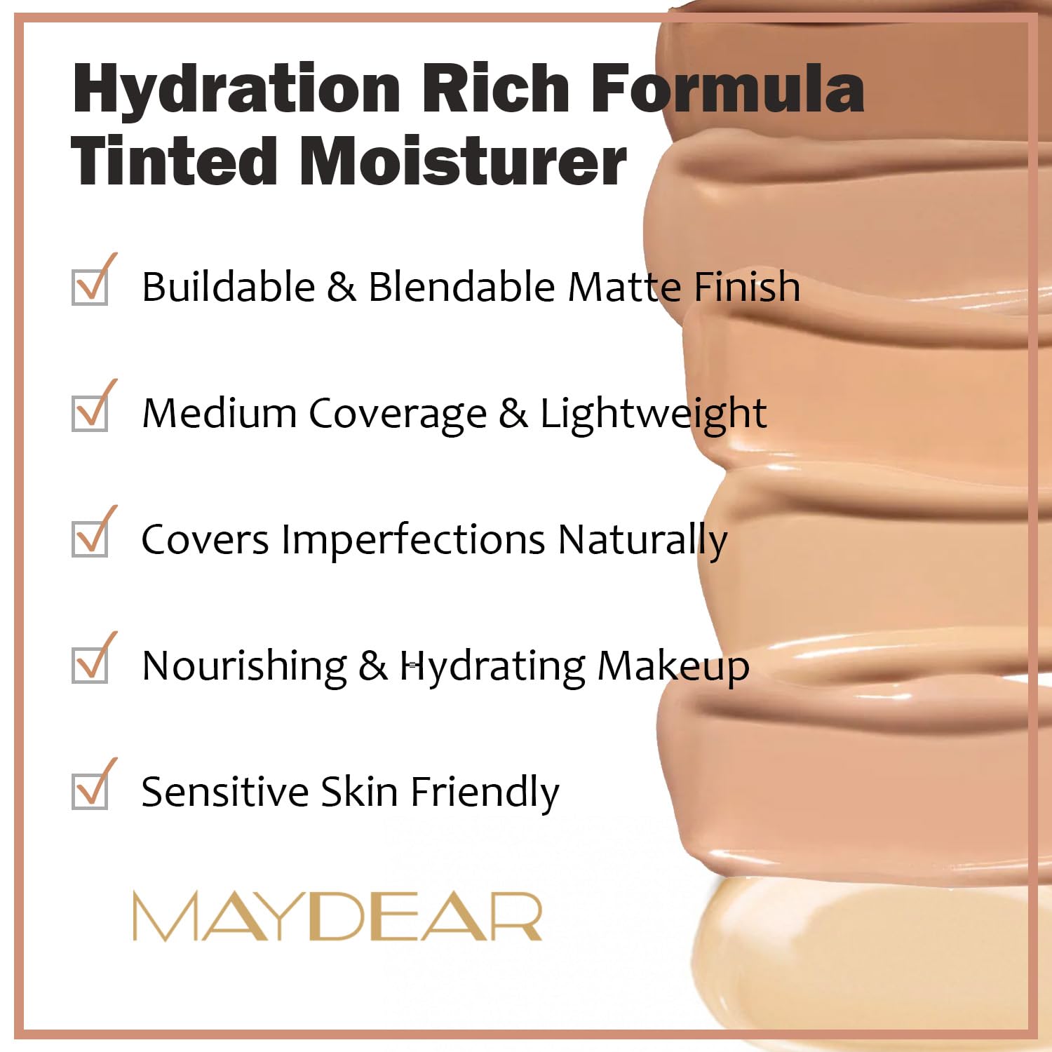 - LIGHTWEIGHT COVERAGE: Maydear tinted moisturizer combines the benefits of a moisturizer and a foundation but is not heavy like foundation. It moisturizes your skin and evens out your complexion with a lightweight coverage.