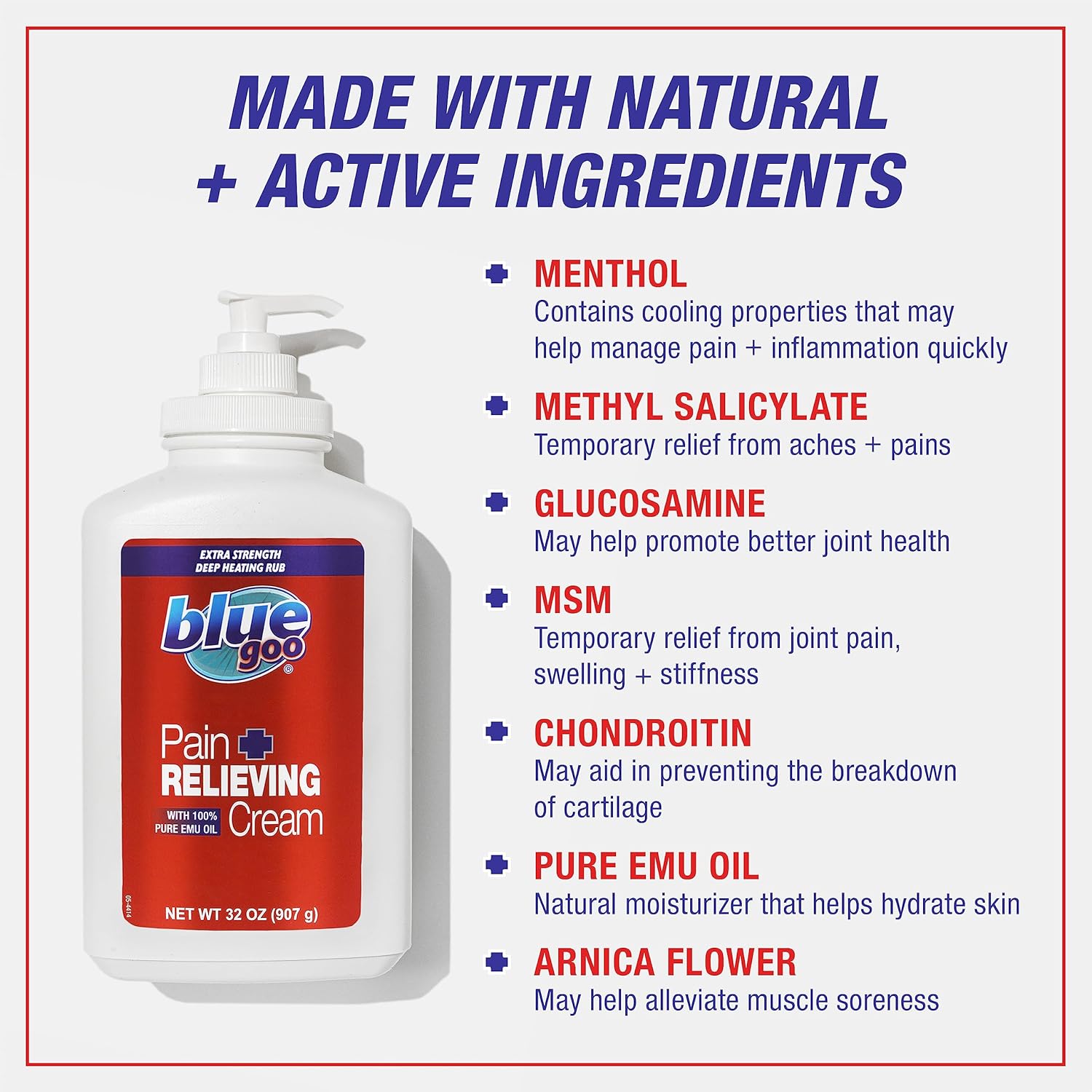 Blue Goo Pain Relieving Cream – for Back and Neck Pain, Sports-Related Muscle and Joint Pain, Sprains and Strains, Maximum Strength Deep Heating Rub, Made with 100% Pure Emu Oil, 32 oz (1 Pack)
