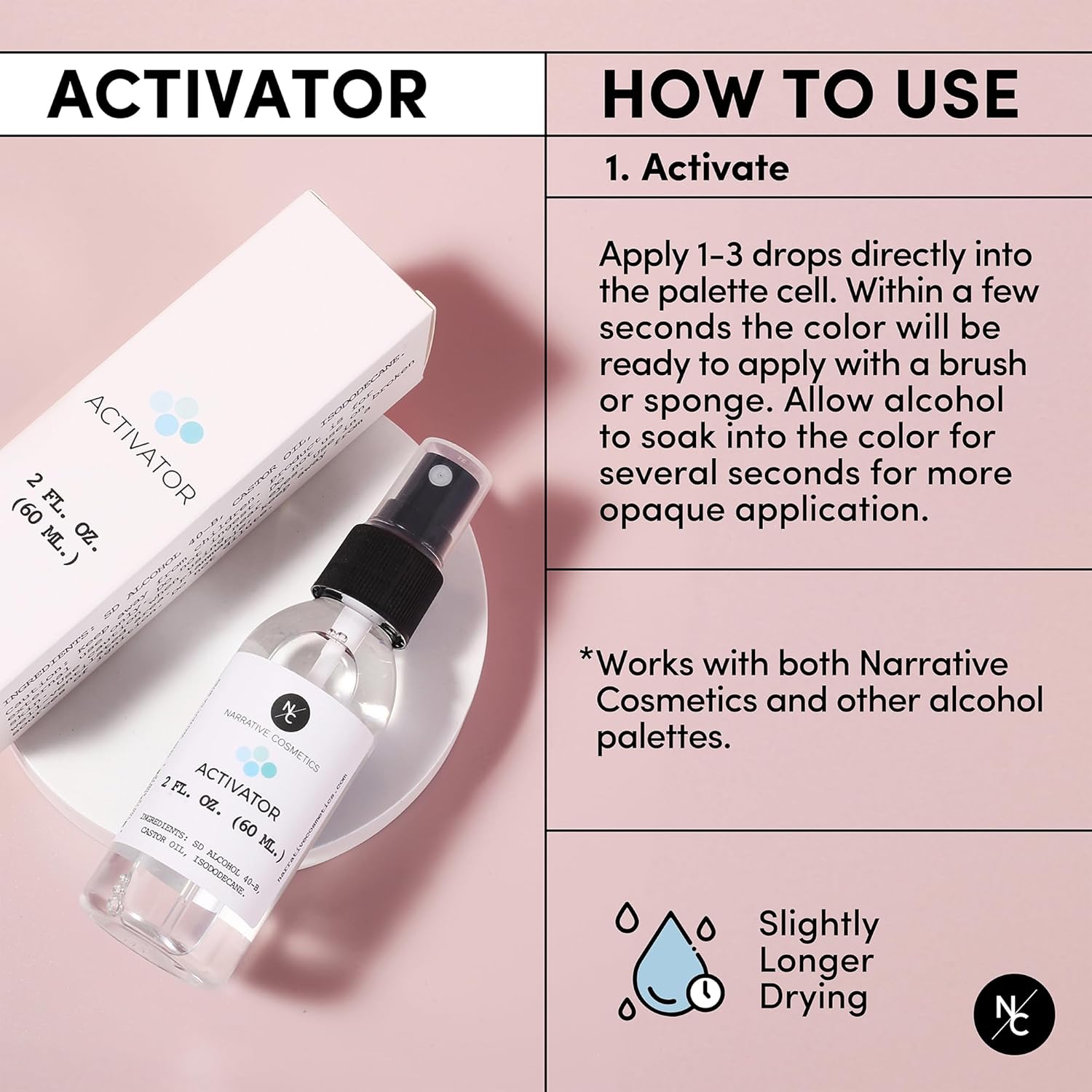 - ALCOHOL-ACTIVATED: Palette colors will appear dry or cracked before activation; Add 99% isopropyl rubbing alcohol or Activator to the pigments before every application