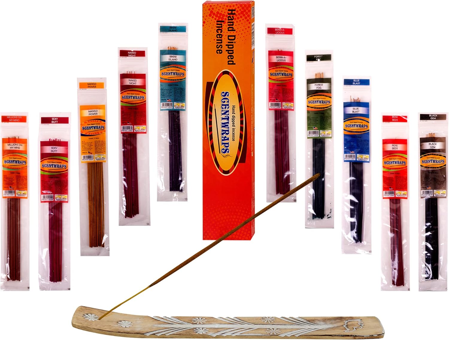 - PRODUCT: This Incense kit combo includes Hem ScentwrapsSet of 10 fragrances - Millions On My Mind, Berri-a-licious, Forest Fog, Rose Beds, Blue Blast, Sexy Butt, Bikini Island, Mango Power, Naked Night, Black Gem.&Raajsee Wooden Incense Holder.(Dimension 10x1.5 Inch).Each Pouch contains 12 sticks.(Total 120 sticks ), Length 11 inch. Each natural stick burns for 60-70 minutes (indoor environment)