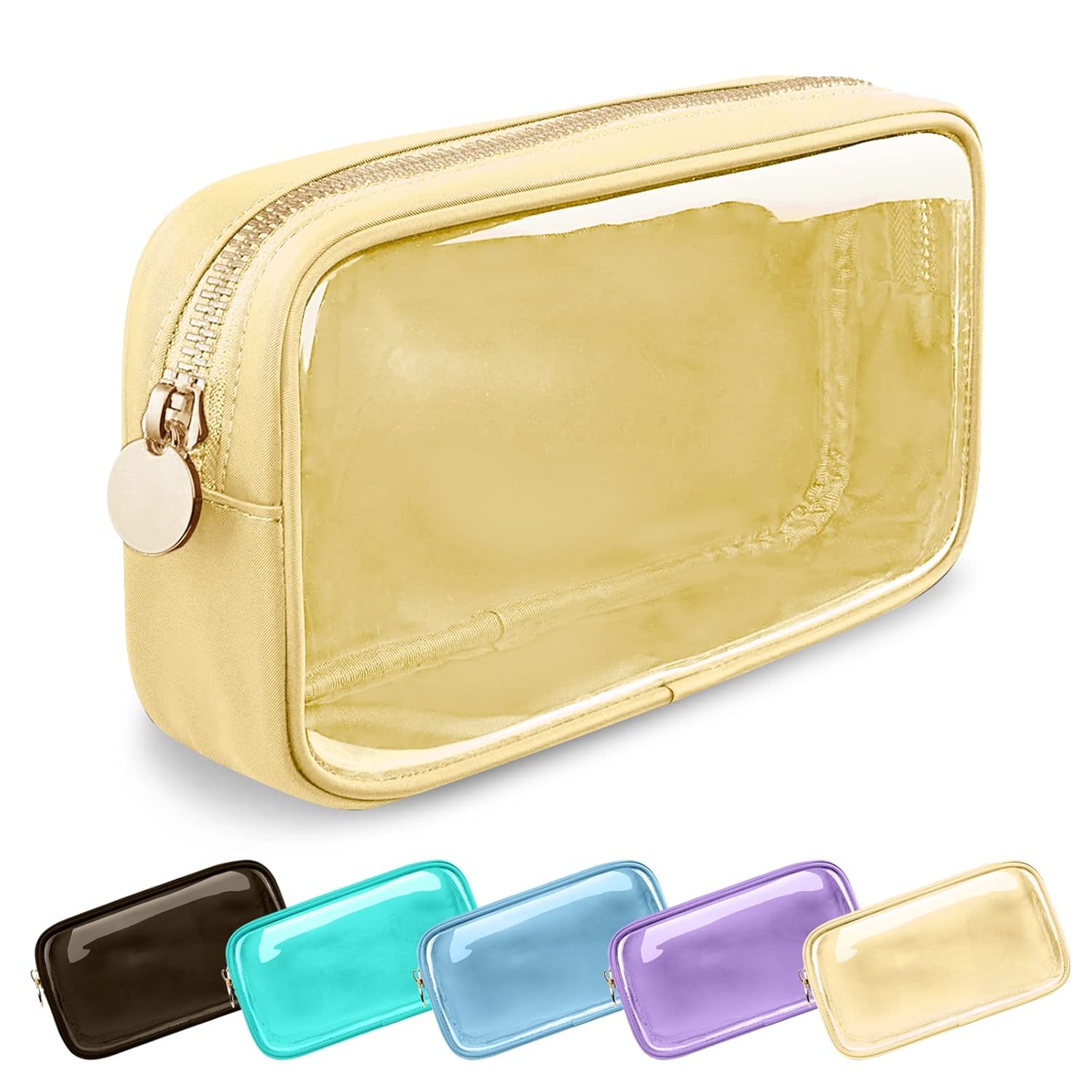 Clear Small Makeup Bag with Zipper, Nylon&PVC Cosmetic Travel Bag Preppy TSA Approved Toiletry Bag for Women Girls, Transparent Waterproof Makeup Pouches Cute Travel Bag for Purse(Small-Beige)