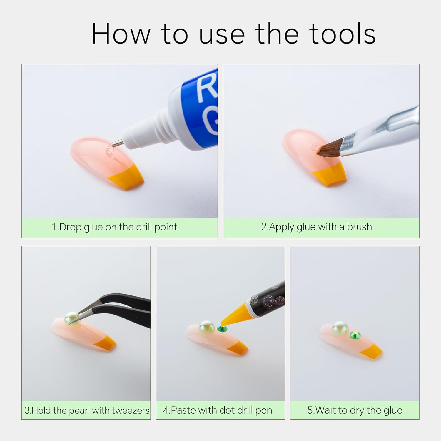 - Useful tools - These pearls and rhinestones have a flat back, which is excellent for easy placement.and you can pick up any large or small pearls and rhinestones with the crayons we bring along. And use the brush to smooth out the Gel, these tools will work very well