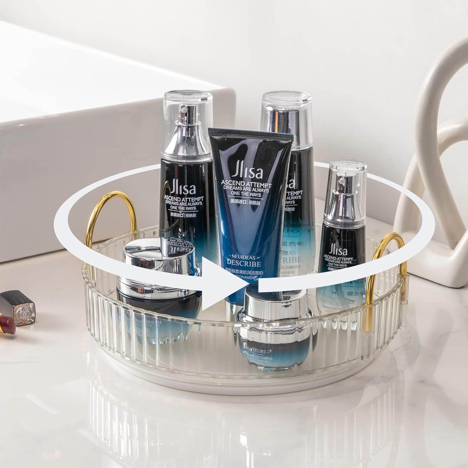 - mooth Rotation: 360 degree rotation makes it easier to find what you need and brings you a convenient using experience. Tray edges are 1.96'' high to ensure that cosmetics do not fall out when