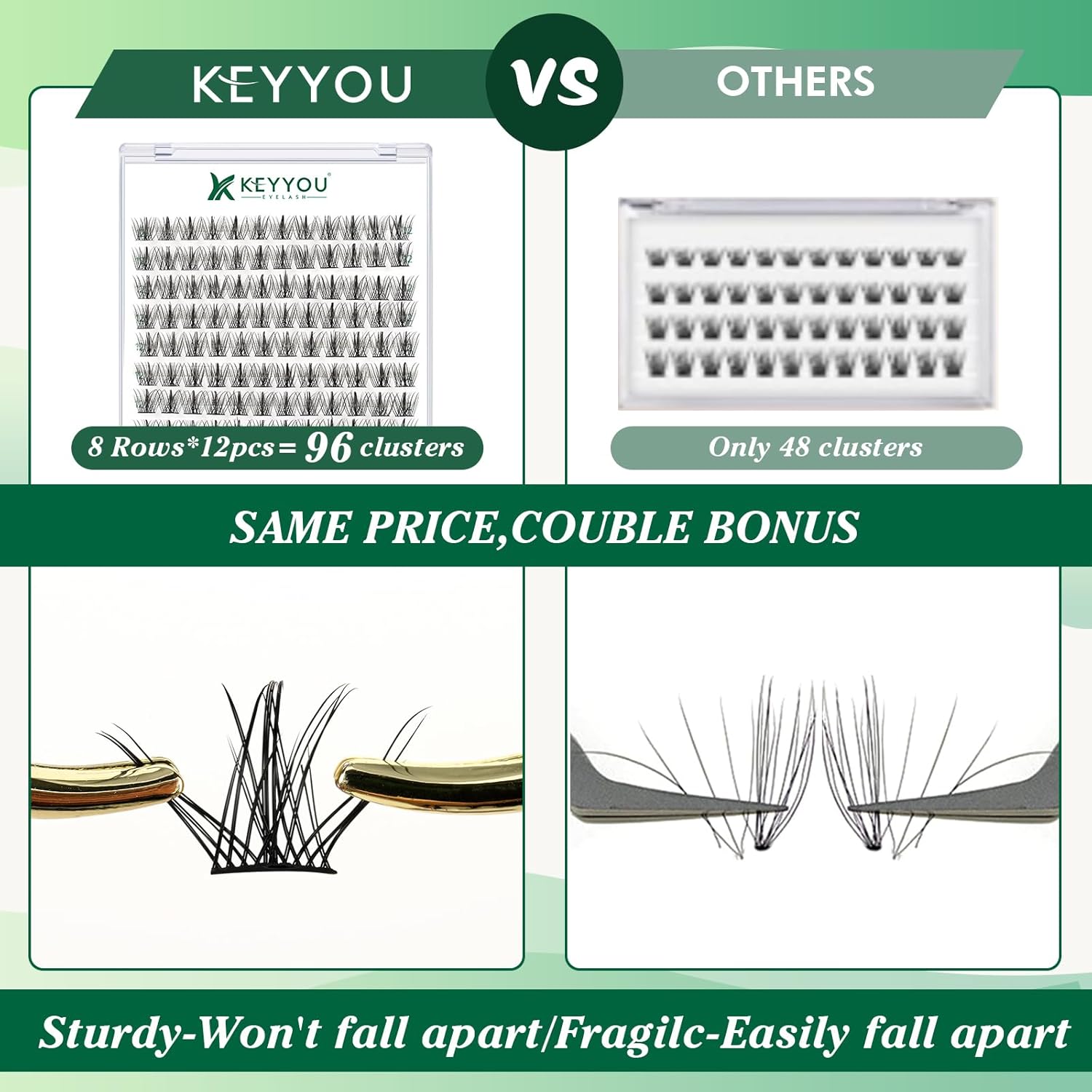 - 【Soft&Comfortable】KEYYOU lash cluster are made of imported materials,the stem line is thinner and softer, the eyelash cluster are lighter and more comfortable to wear.96 clusters in one tray ,more cost-effective.