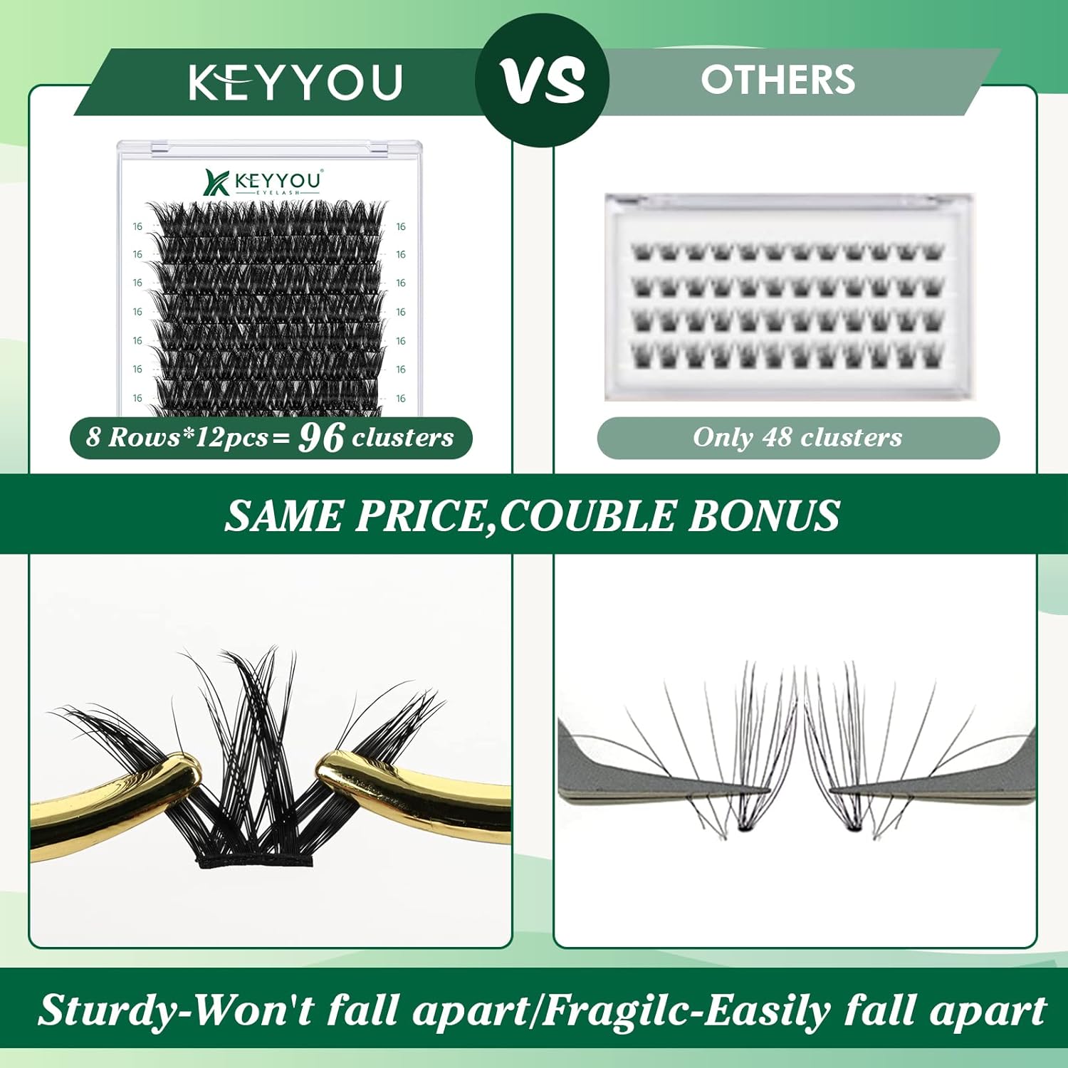 - 【Soft&Comfortable】KEYYOU lash cluster are made of imported materials,the stem line is thinner and softer, the eyelash cluster are lighter and more comfortable to wear.96 clusters in one tray ,more cost-effective.