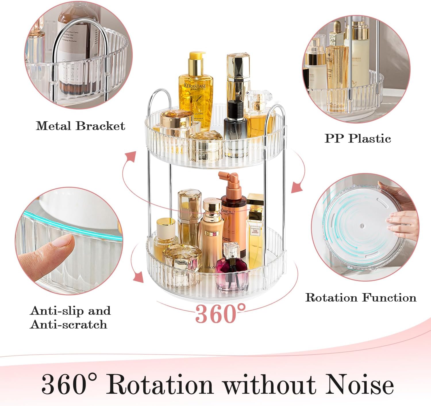 Rotating Makeup Organizer, 360° Spinning Makeup Storage Holder Rack, Dresser Bathroom Organizer Countertop, Large Capacity Perfume Skincare Lipstick Organizer for Vanity.(2 Tiers, Transparent)