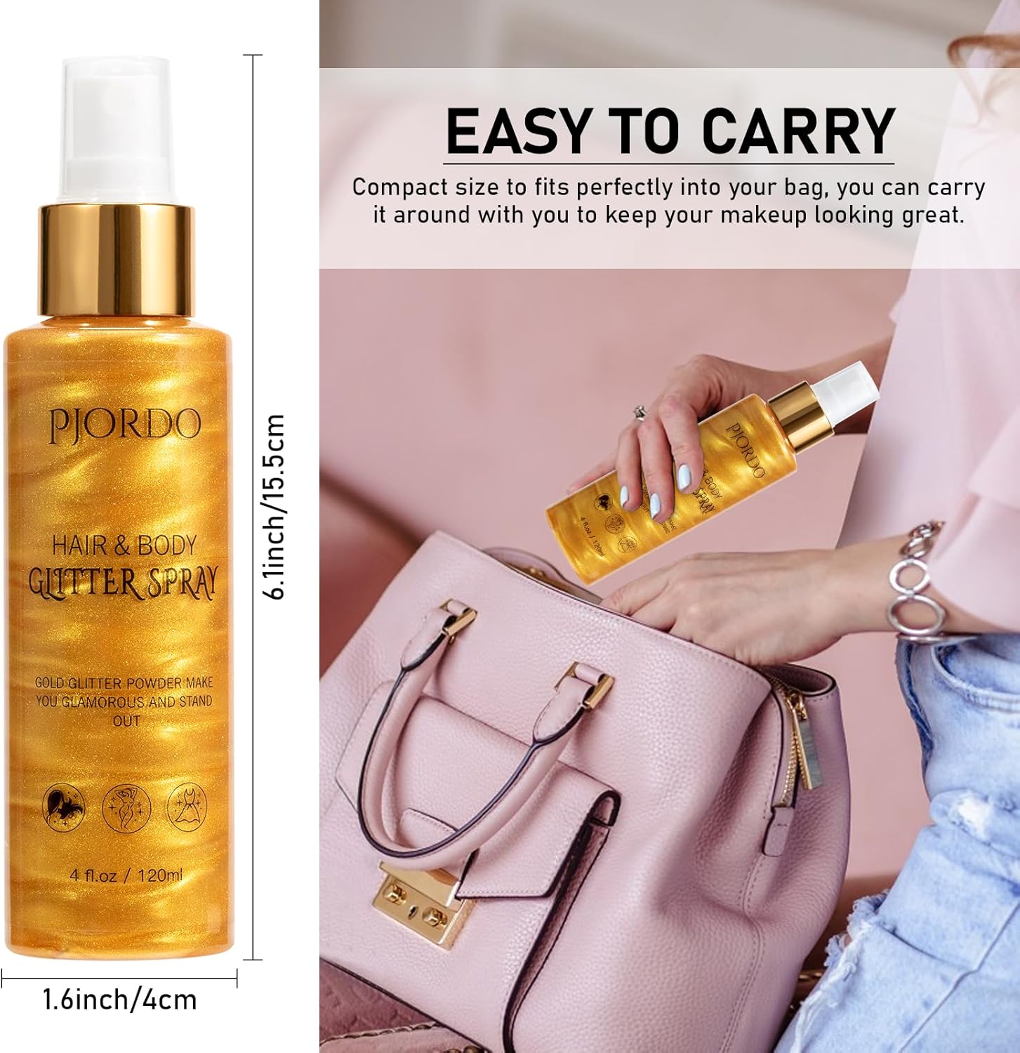 - Shine Like A Star: With the finest gold shimmering particles, it instantly enhances your charm, making you look more glamorous and confident and stand out in all occasions. With just a light spray, it shines under different angles of light, making you a shining and eye-catching focal point in the crowd.