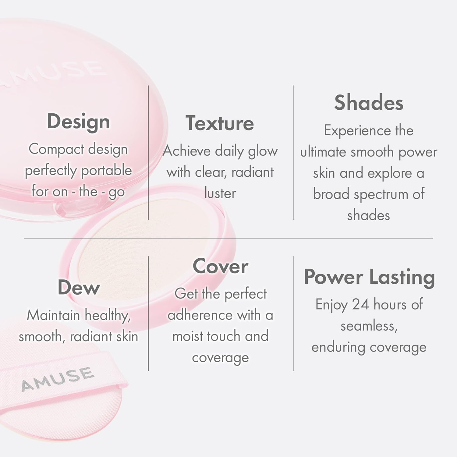 - Power pink cushion and dew puff It's a power pink cushion created by the combination of pink, which symbolizes the vitality of AMUSE GIRL, and transparency that contains honesty. Inspired by AMUSE's signature DEW, the dewdrop-shaped puff meticulously covers even skin curves and enhances adhesion.