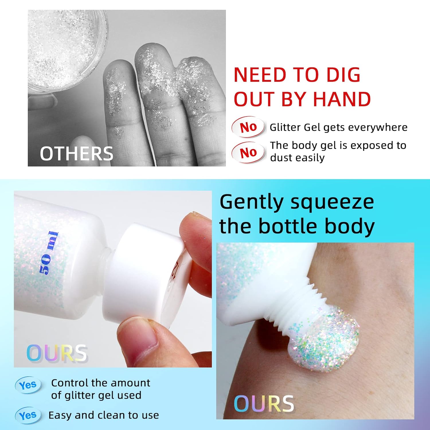 - 【Shining in the nightlight】When the lights are low, glitter gel also has a shimmering effect, which will make your skin sparkle in the dark and add to your charm.