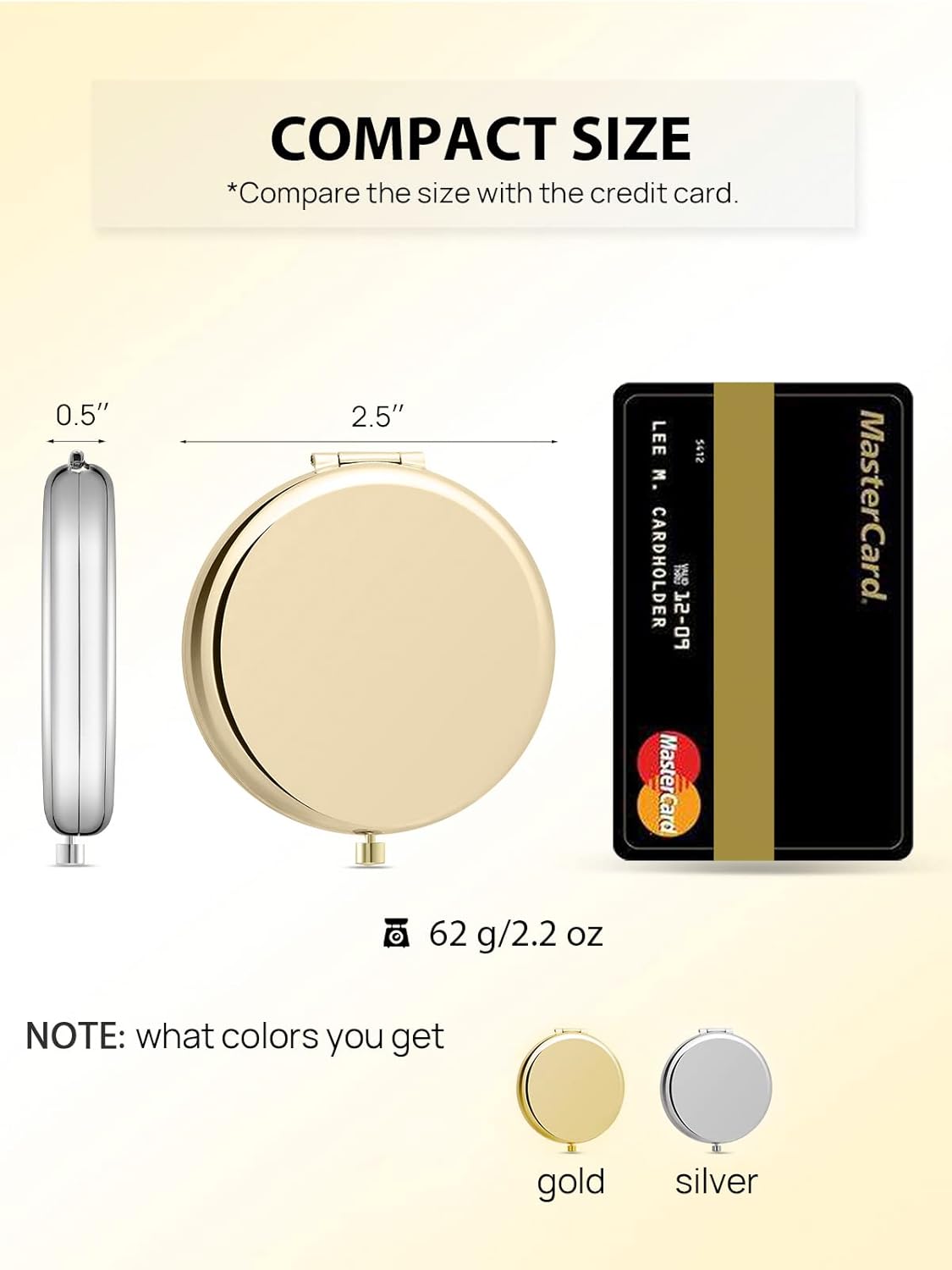 - PORTABLE SIZE & 2 DIFFERENT COLORS SET: Small mirror that is only 2.5 inches in diameter. Fits nicely in your bag, purse, or even your pocket. Experience the luxury of gold and the sophistication of silver(1 piece per color) from the compact mirror set