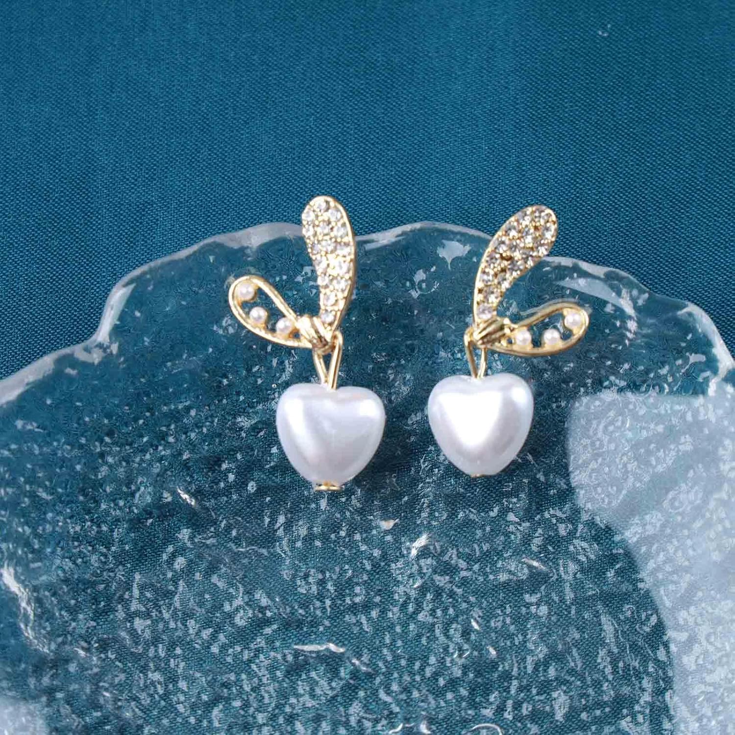 Vintage Crystal Pearl Heart Dangle Earrings Rhinestone Pearl Drop Earrings Gold Cz Pearl Stud Earrings Heart Love Earrings Jewelry for Women