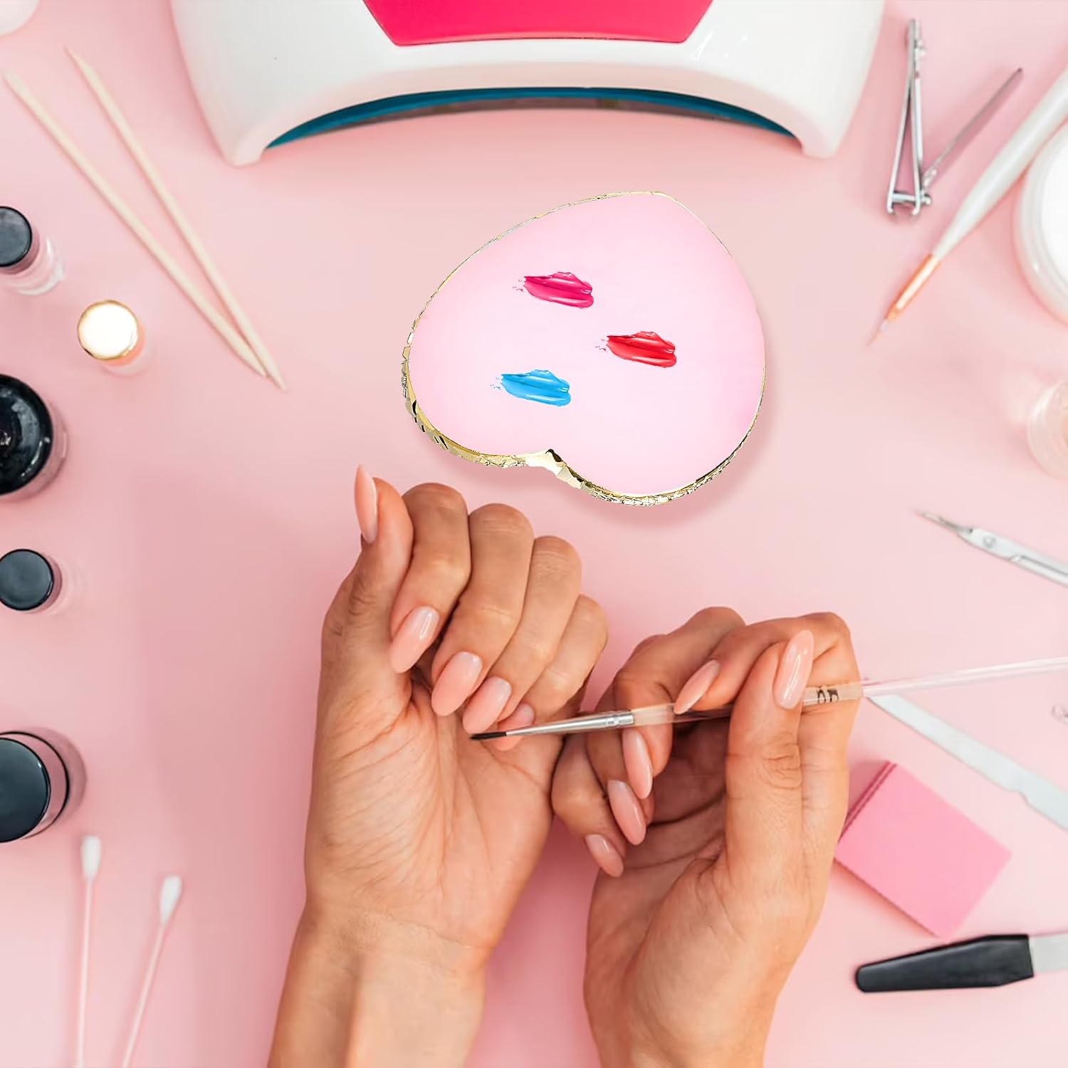 - 【Heart Shape】The nail palette is designed in a heart shape, which looks small and cute, and the edge is designed with gold binding, exquisite and practical, you can mix the colors and pigments you want at will