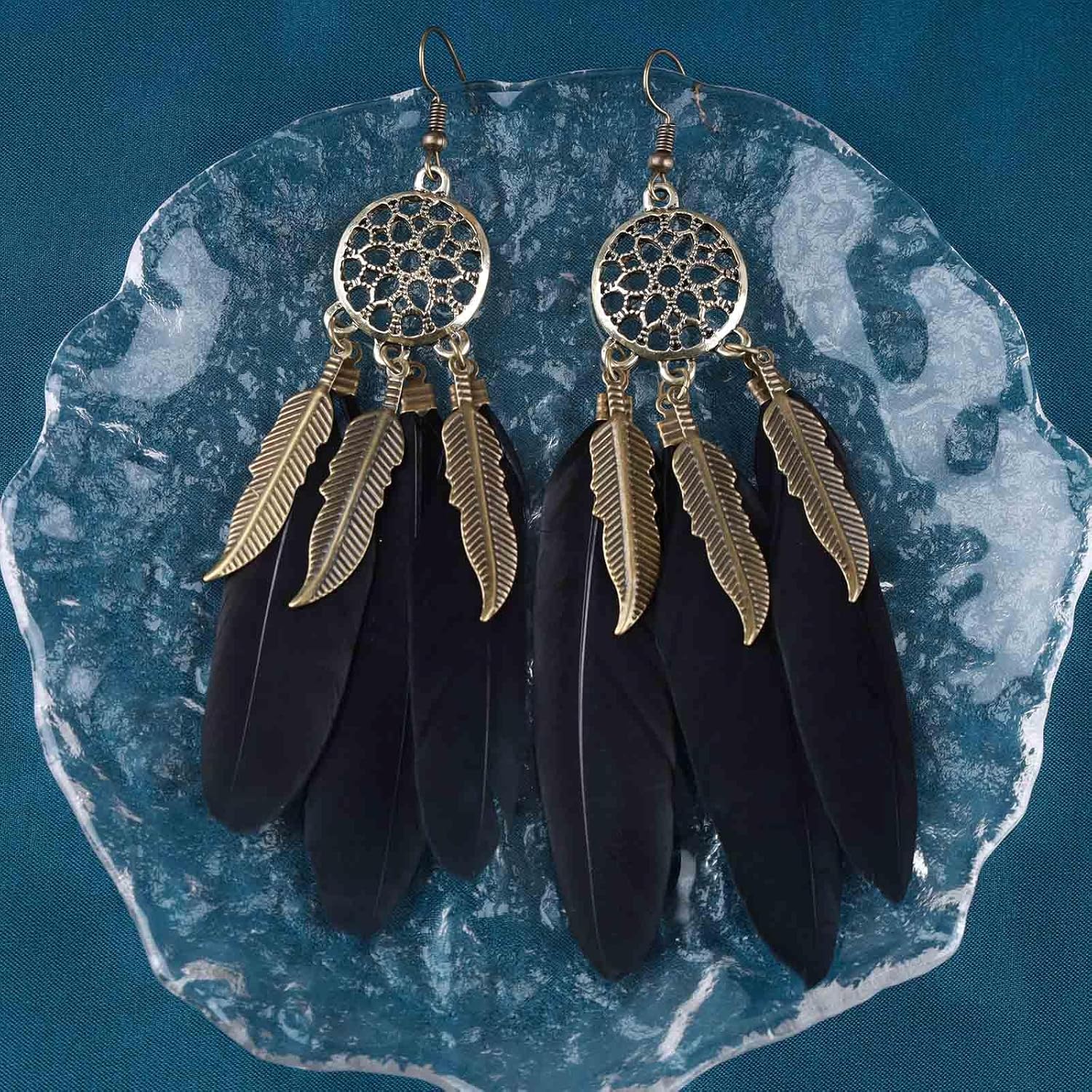 - Black feather drop earrings.Item Details:Handmade Item.Size:As Shown.Color:Black.Materials:Quality Alloy/Feather.Location:Ear.Style:Boho/Vintage.
