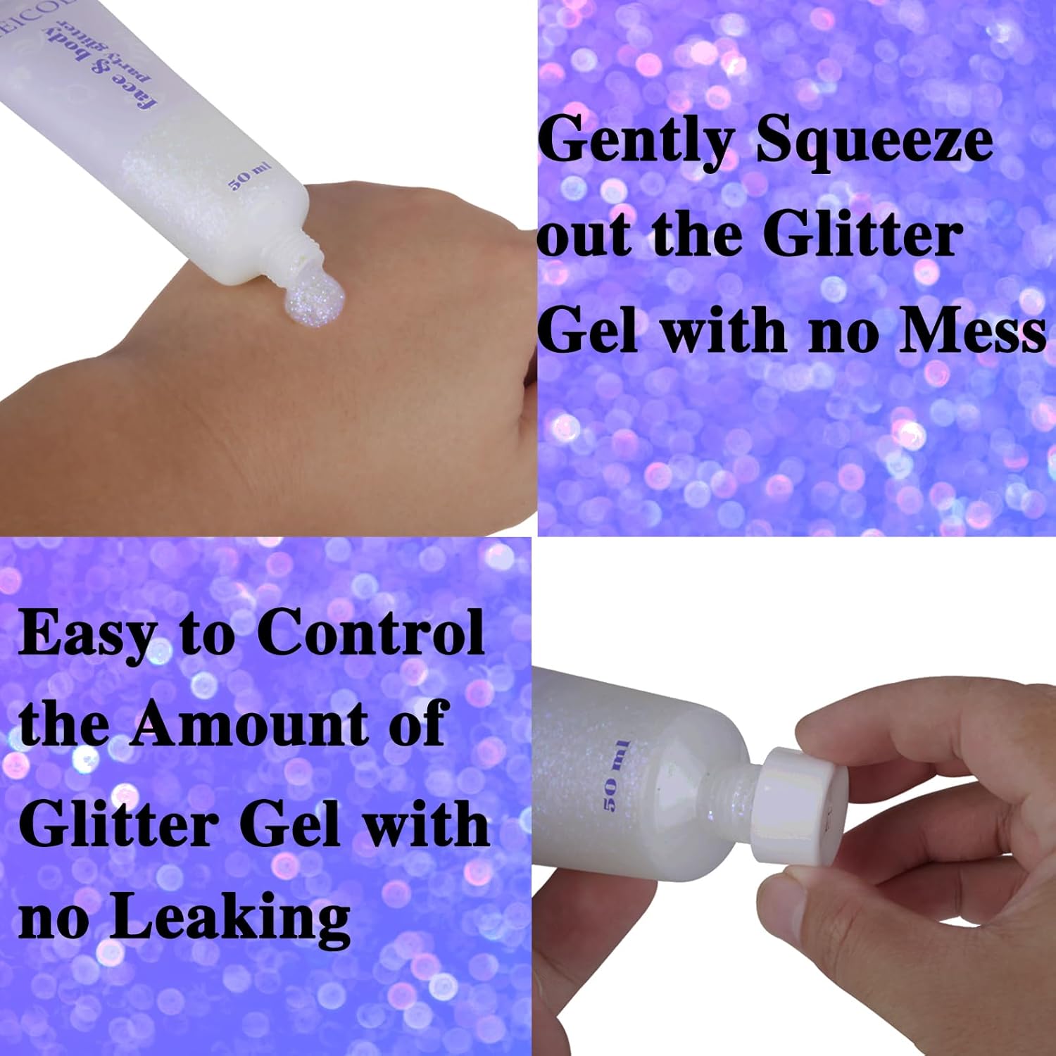 - Many Colors Available --- Our holographic body glitter are rich in many colors,large tube contains 50ml body glitter gel. Large number of holographic sequins, the color and shine of the laser sequins vary with the perspective, like a rainbow,make you be the most attractive fan at the singer concerts
