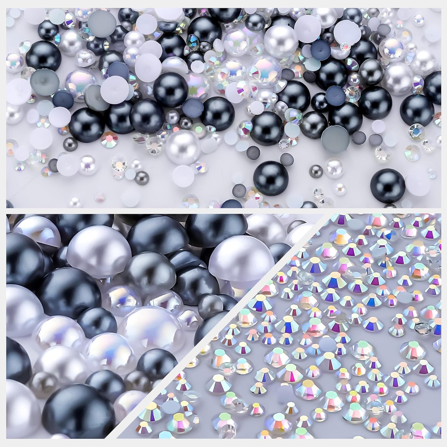 60g Grey White Pearls Rhinestones for Crafts Mixed Size 3mm-10mm AB Color Round Half Pearls Flatback Pearl Beads and Resin Rhinestones Set for Face Art with Glue