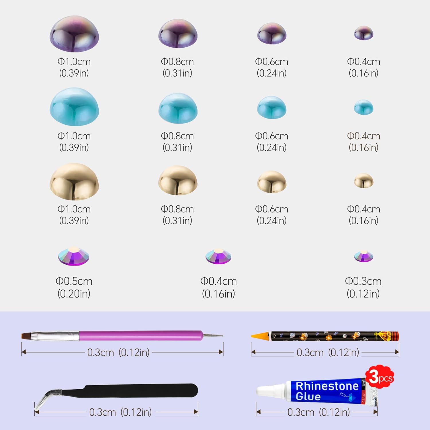 - Assortment Sizes: The flatback half pearls come in a mixture of colors and sizes of 3/4/5/6/8/10mm. The flatback rhinestones are resin rhinestones in sizes of 2/3/4/5/6mm. These mixes are such a great way to get an assortment of colors and sizes without having to buy each item individually