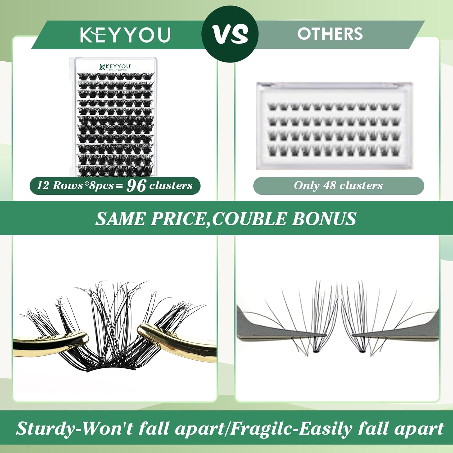 - 【Soft&Comfortable】KEYYOU lash cluster are made of imported materials,the stem line is thinner and softer, the eyelash cluster are lighter and more comfortable to wear.96 clusters in one tray ,more cost-effective.