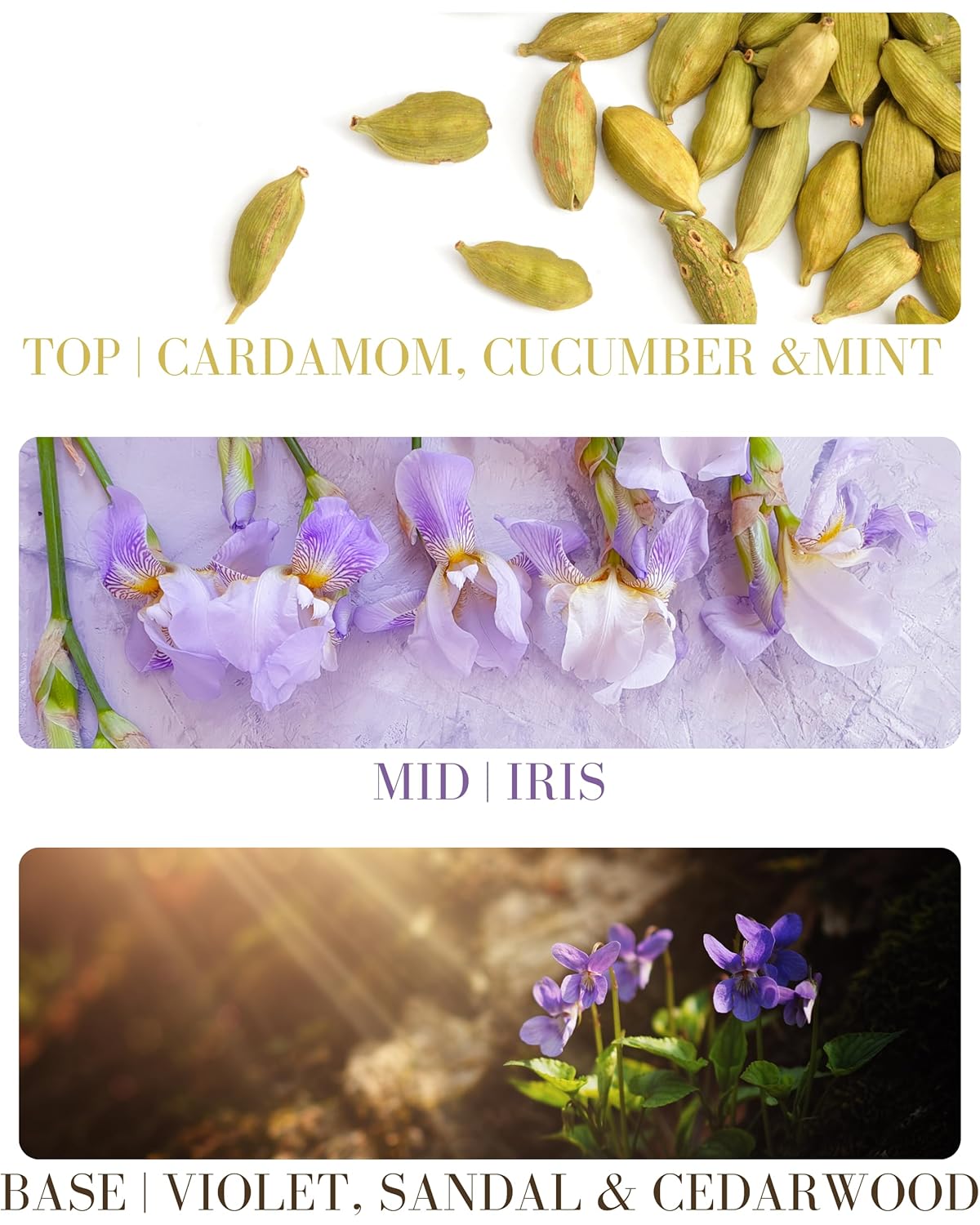- SCENT PROFILE - TOP: Cardamom, Cucumber, Mint, MID: Iris, BASE: Violet, Sandalwood, Cedarwood. Santal is a fragrance that embraces the idea of freedom, roaming wild, and being under big skies. Bursts of fresh green notes await you with Cucumber and Mint, followed by Cardamom, Iris, and Violet notes that tumble into Australian Sandalwood, Cedarwood, and warm spices. All are rounded out with leather, musk, and notes of spice. One to use as you sit around a campfire as the sun slowly sets.