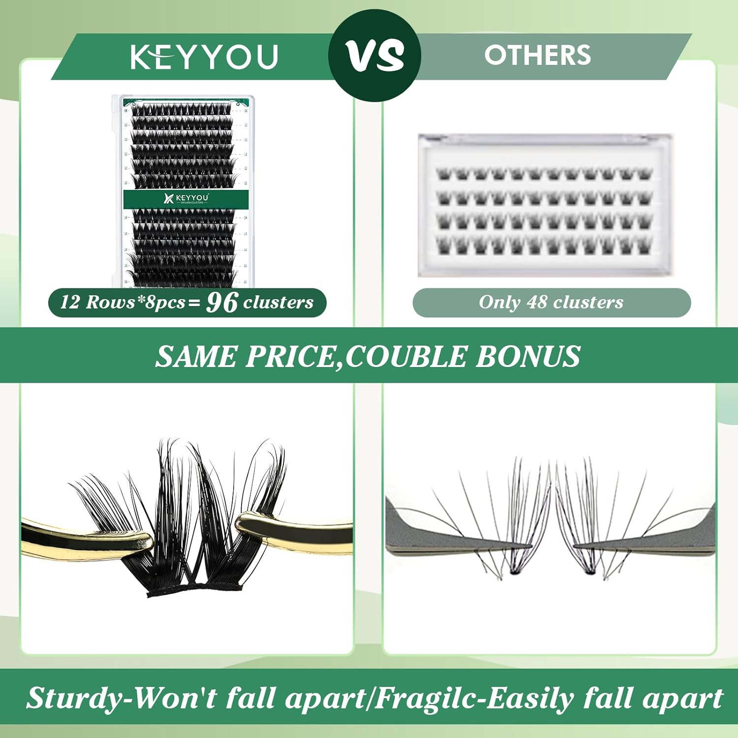 - 【Soft&Comfortable】KEYYOU lash cluster are made of imported materials,the stem line is thinner and softer, the eyelash cluster are lighter and more comfortable to wear.96 clusters in one tray ,more cost-effective.