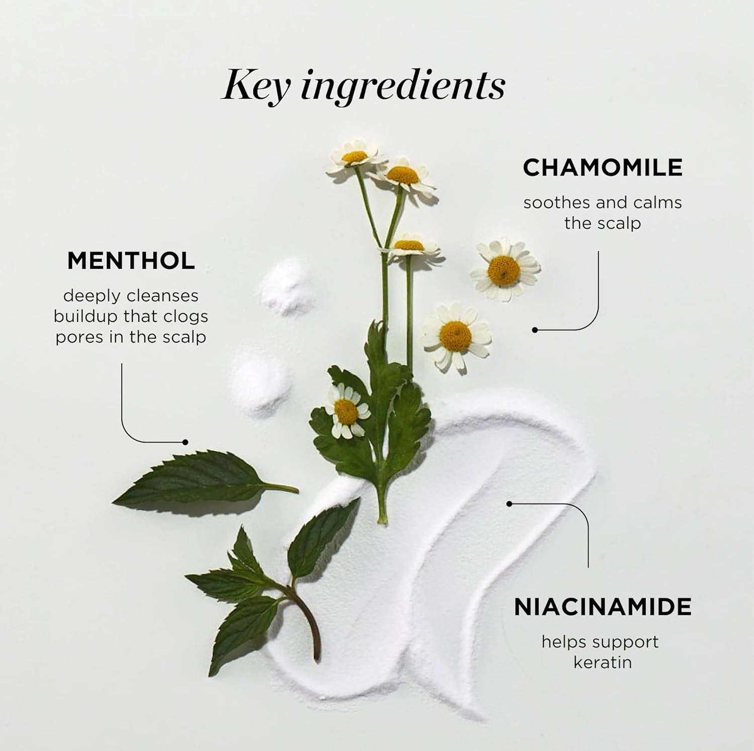 - Formulated with: Chamomile β Known to have calming effects. Niacinamide β Helps support keratin. Menthol β Known to invigorate scalp with a cooling sensation. Rosemary Oil - invigorate the hair and scalp for healthier, thicker, stronger hair. Formulated without: Parabens, silicones, sulfates and gluten.