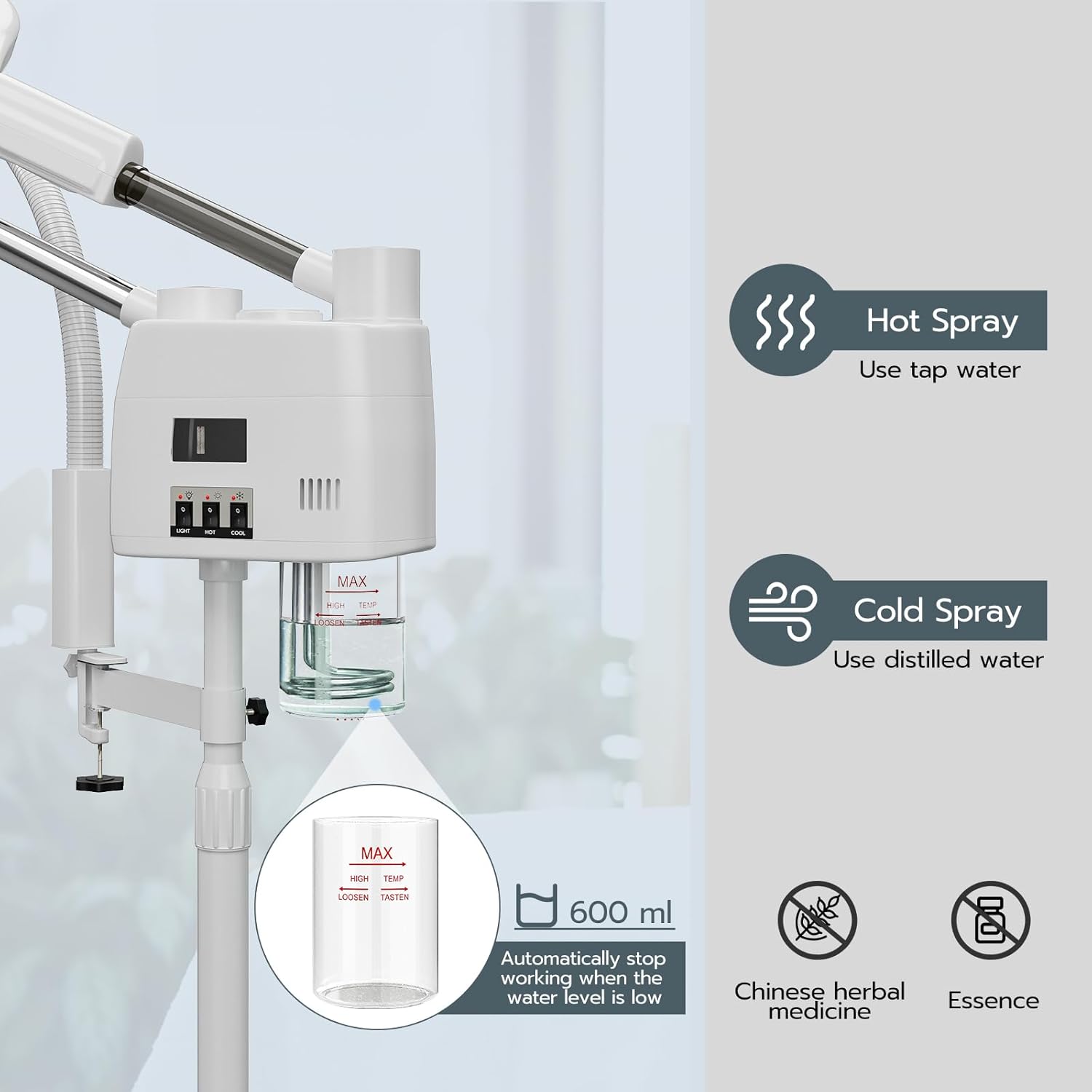 Paddie Professional 3 in 1 Facial Steamer on Wheels for Esthetician, Hot & Cold Mist, 5X LED Magnifying Lamp, White