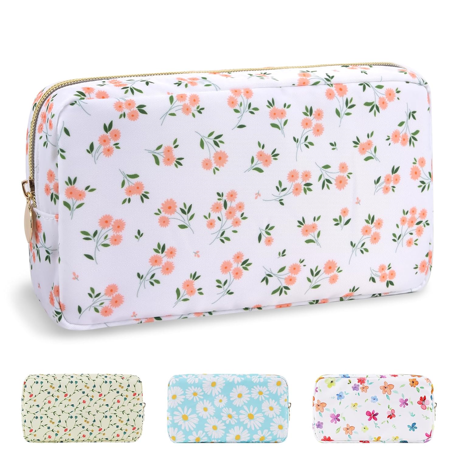 Waterproof Small Floral Makeup Bag Pouch for Purse,Nylon Flower Cosmetic Bag Preppy Travel Toiletry Storage Bag for Women Girl,Cute Makeup Organizer Bag Skincare Bag with Zipper(Small White-Flowers)