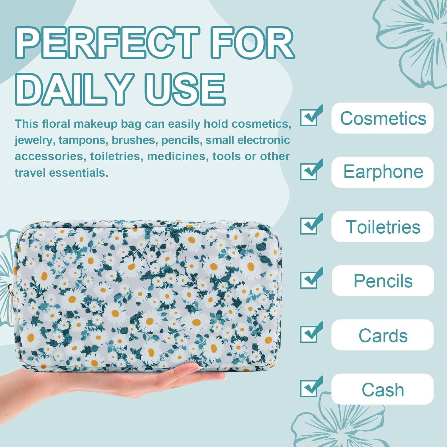 - 【Superior Quality】The floral makeup bag is made of lightweight and durable high quality nylon. It is waterproof and easy to clean, helping to protect your cosmetics and toiletries from water spill accidents.