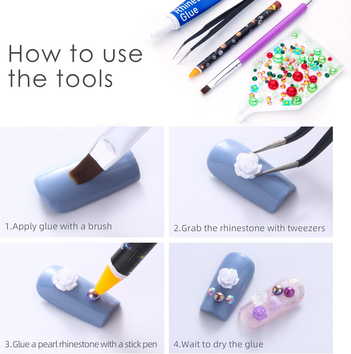 - Useful tools - These pearls and rhinestones have a flat back, which is excellent for easy placement.and you can pick up any large or small pearls and rhinestones with the crayons we bring along. And use the brush to smooth out the Gel, these tools will work very well