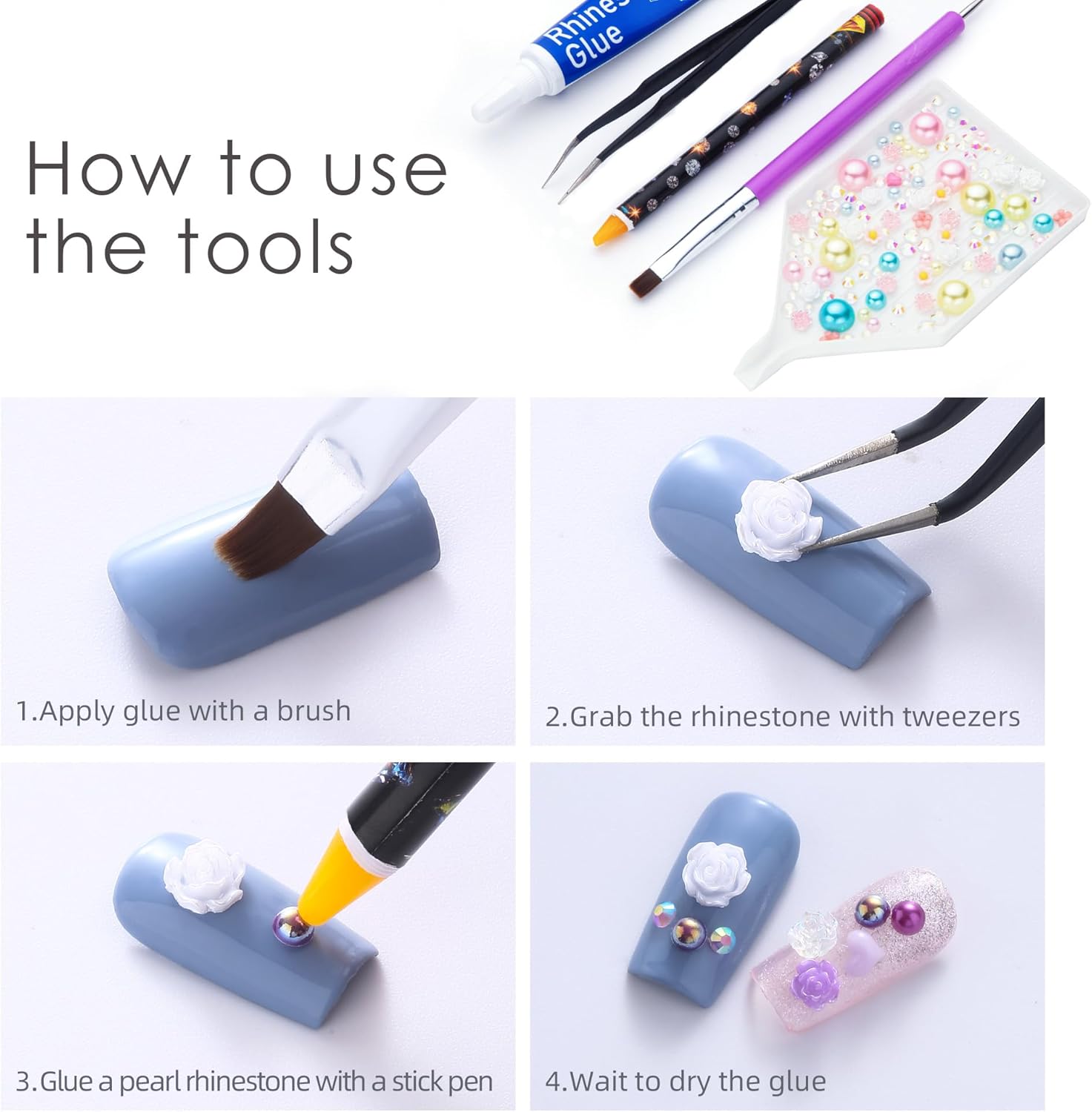 - Useful tools - These pearls and rhinestones have a flat back, which is excellent for easy placement.and you can pick up any large or small pearls and rhinestones with the crayons we bring along. And use the brush to smooth out the Gel, these tools will work very well