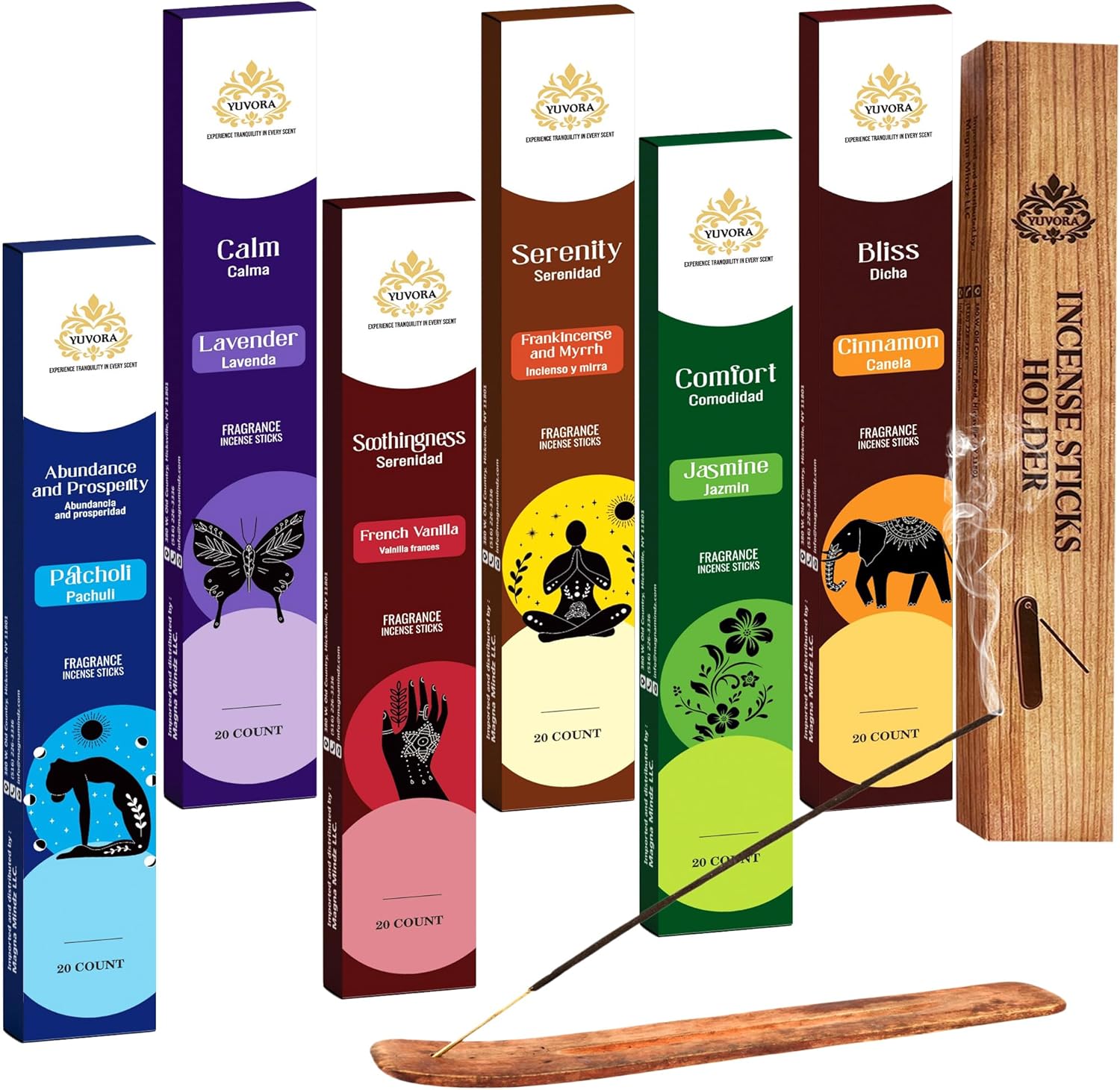 - Variety of Scents for Every Mood – This incense set includes 20 sticks each of Cinnamon, Jasmine, Frankincense and Myrrh, French Vanilla, Patcholi and Lavender, providing endless fragrance possibilities for meditation, yoga, relaxation, aromatherapy, and spiritual healing.